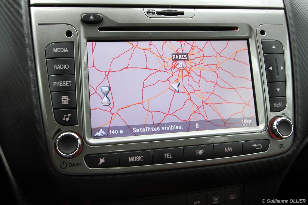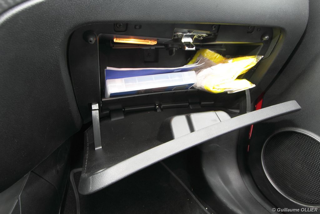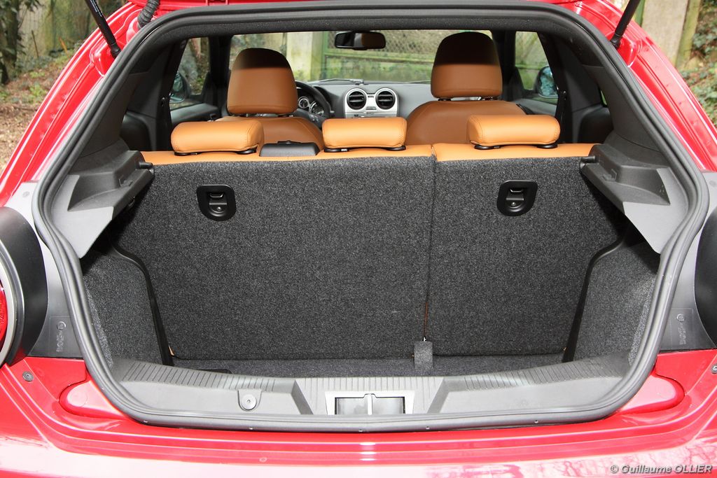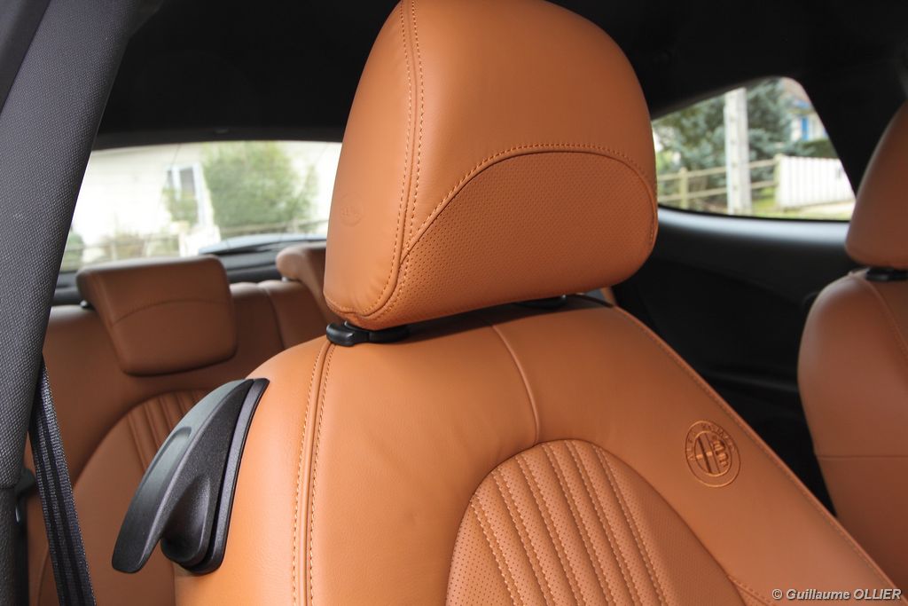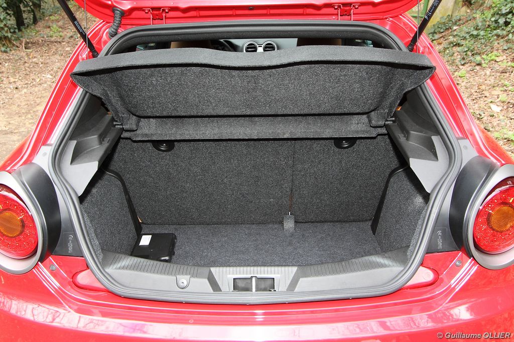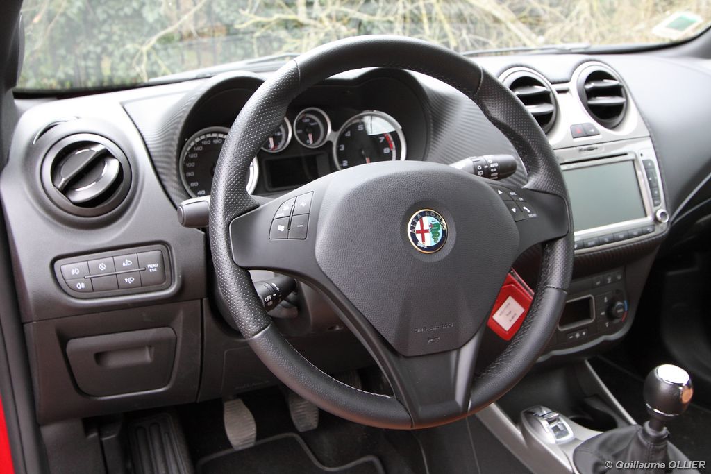 La sportivité est présente également à l’intérieur, tout d’abord avec ces très beaux sièges en cuir. La planche de bord est en simili carbone, comme l’habillage des contre-portes. Dans l’ensemble, la qualité des matériaux et l’assemblage sont de bonne facture. Les pare-soleil toutefois paraissent fragiles. Les compteurs sont très lisibles mais restent similaires à la version normale, dommage nous aurions apprécié que certains éléments de l’habitacle soit exclusifs pour cette version QV. Les sièges sont dotés de différents réglages et offrent un bon maintien. Le volant sport en cuir offre une bonne prise en main même si on aurait préféré une jante un peu plus épaisse. Ce dernier comporte plusieurs fonctionnalités comme le décrochage du téléphone, la sélection du volume et des morceaux de musique. L’ergonomie ne souffre d’aucun reproche. Au chapitre habitabilité, la MiTo est donnée pour accueillir cinq personnes. N’y comptez pas trop, mais deux adultes d’1,80 mètre peuvent s’installer sans problème. Le coffre offre un volume de chargement de 270 litres ce qui reste tout à fait raisonnable pour une citadine. Il s’étend jusqu’à 684 litres lorsque vous rabattez la banquette arrière, ce qui nécessite d’avancer un peu plus les sièges avant… Le seuil de chargement est un peu haut à notre goût. Enfin, les rangements à bord sont multiples, comme le bac situé à l’intérieur de l’accoudoir central ou encore le petit tiroir situé sur la gauche du tableau de bord.