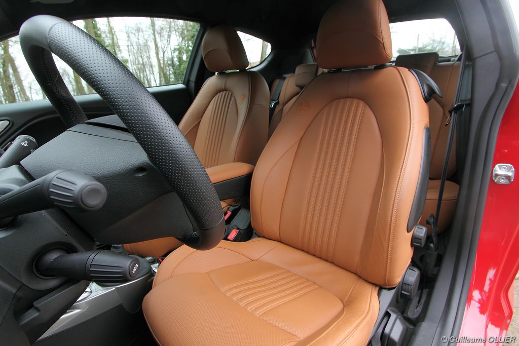 Le bloc essence de 170 ch et d’une cylindrée de 1 368 litres est associé au système MultiAir. Le principe de fonctionnement de cette technologie est la possibilité de régler en permanence les principaux composants du mélange, et en particulier de l’air admis, pour garantir une combustion optimale pour n’importe quel régime suivant les conditions. De plus, un système électro-hydraulique s’occupe de la gestion des soupapes afin de réduire les consommations et les émissions. Ce 1.4 MultiAir affiche ainsi un très bon rendement de puissance avec 124 ch par litre et son rapport poids/puissance est de 6,7kg/ch ! Les performances sont au rendez-vous avec 7,5 secondes au 0 à 100 km/h, et une vitesse maximale atteignant 219 km/h. Avec un couple disponible plus tôt, la souplesse est de mise. Même en sixième la voiture ne broute pas à bas régime ! Lorsque l’on monte dans les tours le moteur se montre très disponible et sur toute la plage d’utilisation où il émet une sonorité rauque agréable. Les reprises sont quand à elles franches. Le système DNA (Dynamic, Normal, All Weather) permet l’alliance entre sobriété et sportivité ! Situé sous la console de climatisation un sélecteur offre au conducteur trois modes de conduite différents. En position « Normal », les commandes sont douces et le confort de roulage plus important. Dans cette configuration on pourrait même se demander où sont passés les 170 ch ! On observe une certaine douceur au démarrage, les montées en régimes se font alors très progressivement. Mais lorsque l’on enclenche le mode « Dynamic » on est tout de suite rassuré. Ce dernier procure de meilleures