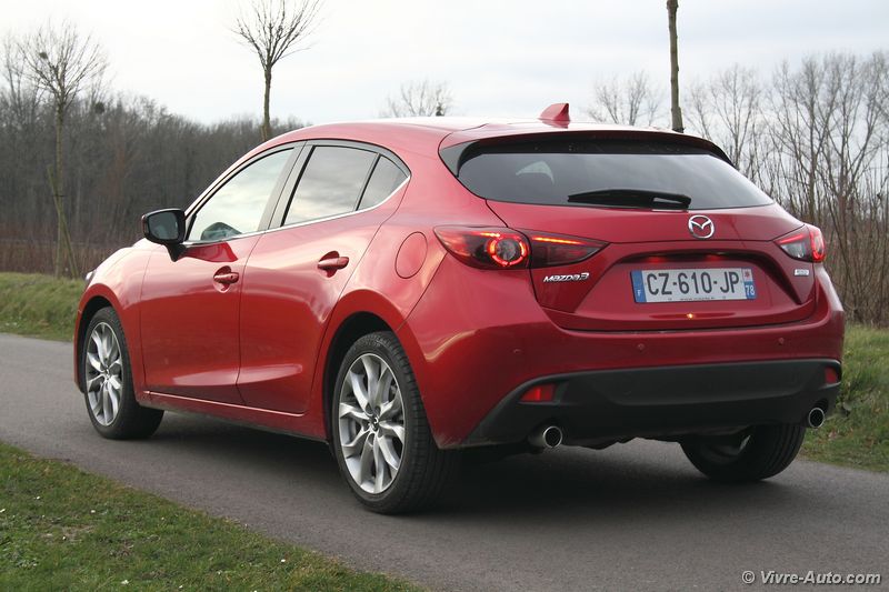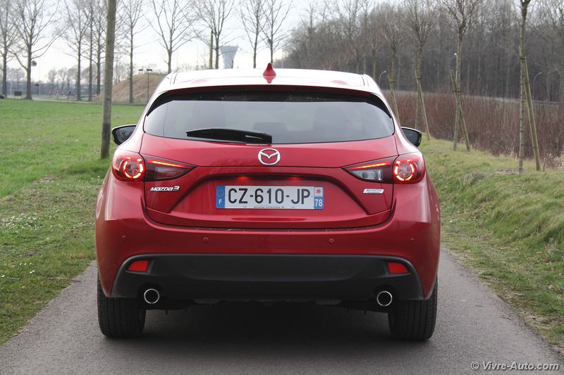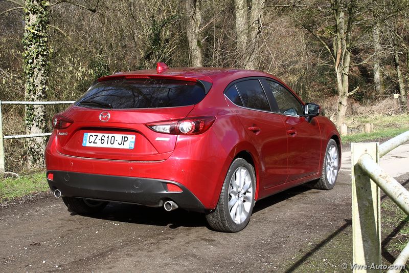La nouvelle Mazda 3 succède à la deuxième génération après seulement quatre ans. S’inspirant des dernières créations de la marque et empruntant la ligne de style « Kodo », elle apparaît encore plus dynamique qu’avant. Au programme, un long capot, un bouclier avant plus musclé, des feux effilés et une ceinture de caisse plongeante. Plus large et plus basse, elle mesure 4,46 mètres de long, c’est 21 cm de plus qu’une Peugeot 308 ! Son empattement gagne 6 cm. Déclinée en version trois ou cinq portes, en France seule la Mazda 3 cinq portes est proposée. Cette nouvelle génération est 100% inédite, il n’est plus question d’employer la plateforme de la Ford Focus mais celle issue du Cx-5 et de la 6. Globalement, nous la trouvons très séduisante sous tous les angles et elle répond bien aux attentes des consommateur Européens.