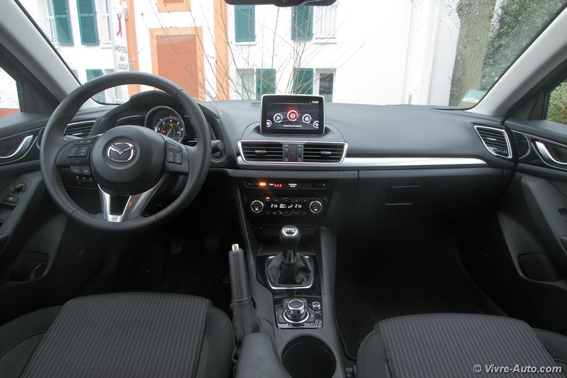 A bord, on monte en grade. En effet, par rapport à la précédente génération il n’y a plus rien à voir. L’ensemble présente bien et n’est pas sans nous rappeler les intérieures de chez BMW avec par exemple la console centrale tournée vers le conducteur. Mais en y regardant de plus près on s’aperçoit que les plastiques sont durs, notamment sur les contre porte. On est donc pas encore au niveau d’une 308 ou d’une Golf. Pour ce qui est de l’ergonomie je tire mon chapeau ! Toute les commandes tombent aisément sous la main mais ce qui se montre le plus pratique c’est le système multimédia. Relayé sur un écran tactile de 7 pouces il se pilote par le bais d’une molette et de boutons situés entre les deux sièges. J’ai réussi à faire le tour de l’ensemble des fonctions en un rien de temps. Le bouton « favoris » affiche la liste de vos stations de radios favorites et le volume est également à porté de main. Cette nouvelle Mazda 3 dispose aussi d’un affichage tête haute, très appréciable. Mais il manque un équipement que l’on retrouve de plus en plus dans les voitures et même maintenant chez les citadines c’est la caméra de recule. La