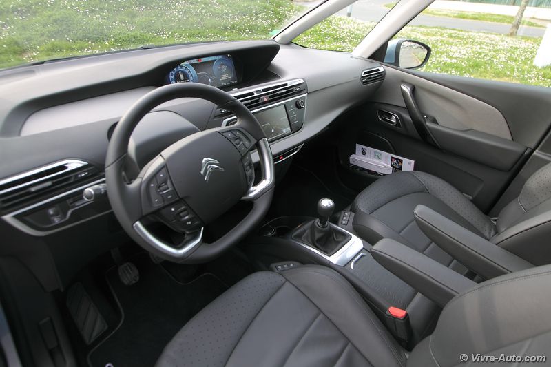 La conception du nouveau C4 Picasso serait alors tournée vers un « esprit loft » selon le marketing. Mais comment interpréter ceci ? Après avoir passé plus d’une semaine à bord des deux modèles on comprend mieux ce que voulait dire le constructeur. On se sent très bien à bord du C4 Picasso, les sièges sont enveloppant et moelleux et le grand pare-brise offre une excellente visibilité. Les pares-soleil sont toujours coulissants. Notre Grand C4 Picasso était doté du Pack Lounge (850€ en option) qui offre des équipements digne d’une berline : sièges avant massant, appuies-tête Relax, siège passager inclinable et repose mollet… Vous l’aurez compris tout est fait pour choyer les occupants.