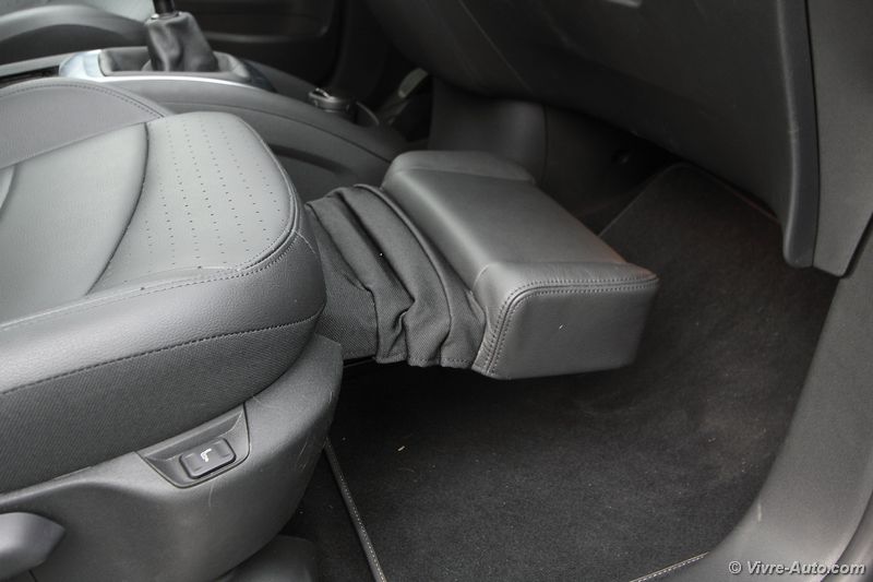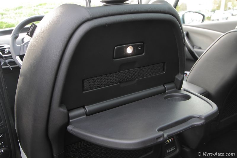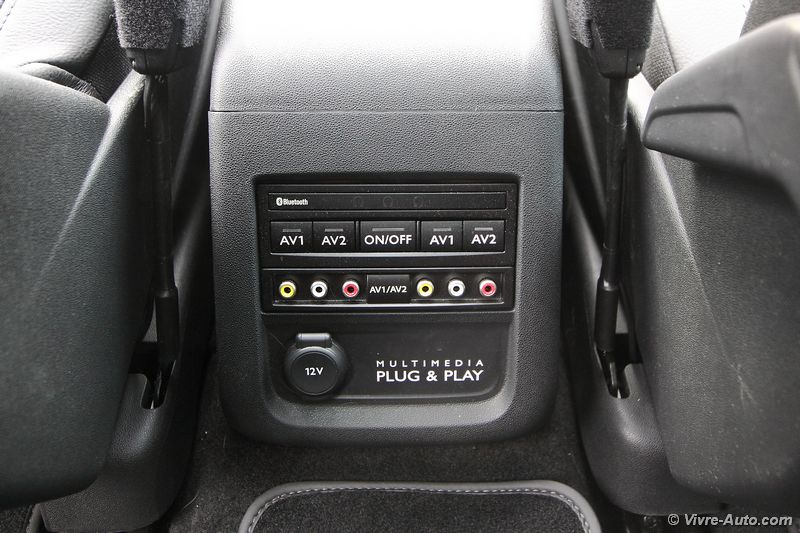 Mais passons à l’arrière, la deuxième rangée offre des sièges tous de même largeur et coulissant avec dossier inclinable. L’espace aux jambes est bons mais un adulte de plus de 1,80 mètre touchera le toit. Petit détail pratique, les tablettes des dossiers des sièges avant sont maintenant éclairés. Un pack multimédia propose une prise 230V, un lecteur DVD, la Hifi JBL et le système multimédia Plug&Play avec deux écrans dans les appuies-tête. Côté habitabilité donc, c’est toujours aussi appréciable. Les rangements sont également de la partie avec pas moins de 16 endroits différents, mention spéciale pour le rangement centrale au bas de la console qui, une fois ouvert permet de poser son téléphone et de l’alimenter via les différents connecteurs.