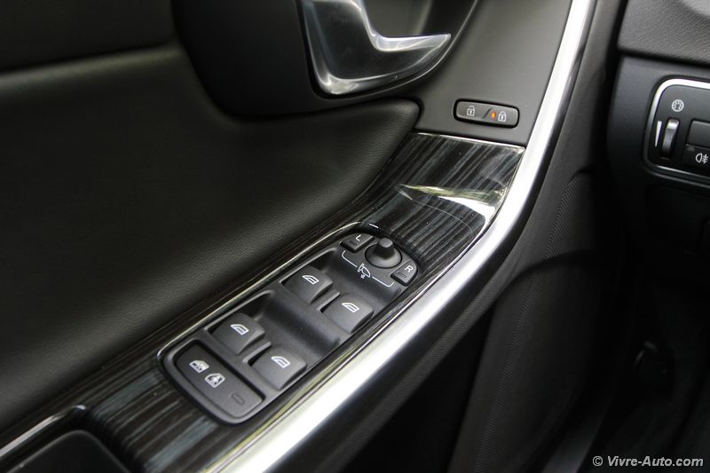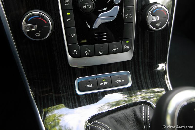 Les présentations sont faites, c’est le moment de prendre le volant après une charge complète de la batterie qui aVolvo V60 Plug-In Hybrid - Vivre Auto durée un peu plus de 4 heures sur notre prise 10A. Précisons qu’une fonction de pré-conditionnement permet de programmer, via l’ordinateur de bord ou à distance avec une application smartphone (Volvo On Call), le dégivrage, la climatisation ou le chauffage au degré près ! Comme d’habitude on apprécie le silence à bord lorsque le moteur thermique n’est pas employé. Le constructeur annonce 50 km d’autonomie en tout électrique, bien sûr cela varie selon les conditions climatiques et les parcours. Sur plusieurs cycles de recharge nous avons en moyenne roulé pendant 40 km avec une conduite souple. Le moteur Diesel ne s’enclenche que très rarement, seulement si l’on sollicite vivement l’accélérateur. On peut ainsi emprunter les routes jusqu’à 120 km/h en roulant sur batterie, c’est un bon point. Le break dispose d’un système de régénération d’énergie lors des phases de décélération afin Essai Volvo V60 Plug-In Hybrid - Vivre Autode prolonger l’autonomie de la batterie. Nous nous attendions à disposer d’un frein moteur lorsque l’on lâche la pédale d’accélérateur mais malheureusement ce n’est pas le cas et c’est bien dommage. Beaucoup de véhicules hybrides emploient ce système et la conduite devient plus appréciable notamment en ville, mais sur la V60 il faut freiner ! Nous vous parlions de nouveaux boutons sur la console centrale, mais à quoi servent-ils ? Une fonction « Save » permet de garder le niveau de charge actuel de la batterie, nous l’actionnons par exemple lorsque nous sommes sur route et que nous empruntons une agglomération par la suite. Elle sert également à recharger la batterie lorsqu’elle est vide, mais sont utilisation reste limitée du fait de la surconsommation de carburant engendré et de la durée. Les autres fonctions concernent la conduite. Le mode « Pure » permet de rouler en 100% électrique jusqu’à l’épuisement de la batterie, le mode « Power » cumule les deux moteurs pour une puissance maximale de 283 ch et un couple de 440 Nm. Le o à 100 km/h est d’ailleurs abattu en seulement 6,1 secondes ! Le mode « Hybrid » qui est actionné par défaut, gère automatiquement l’ensemble du système en favorisant toujours l’utilisation de l’électrique en priorité.Volvo V60 Plug-In Hybrid - Vivre Auto Enfin, la fonction « 4WD » offre une transmission intégrale permettant d’emprunter des chemins difficiles ou de rouler sur la neige.