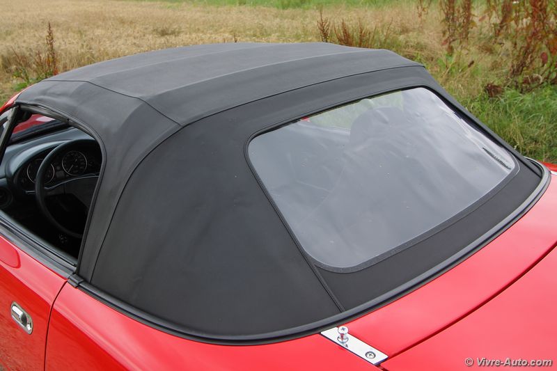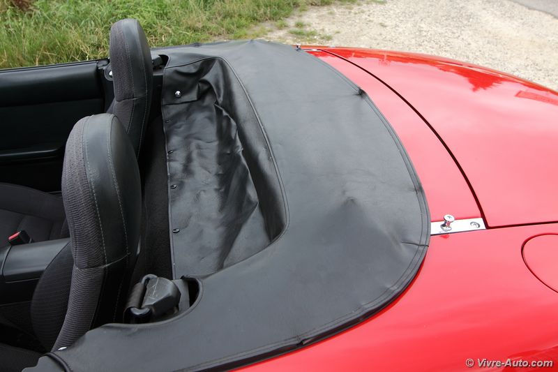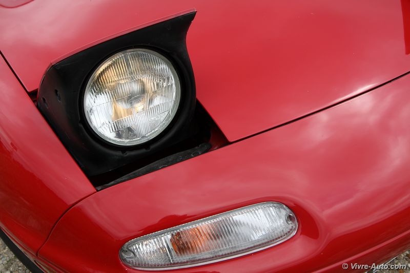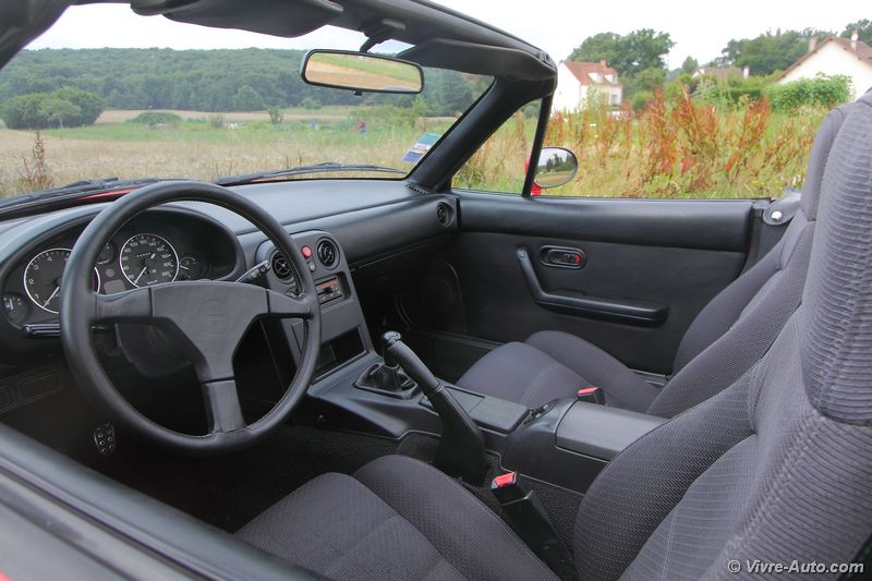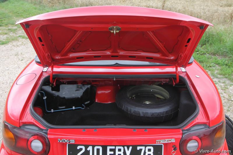 l’autoradio et honnêtement on s’en passe sans problème tant le chant du quatre cylindre est un régal pour les oreilles. Seul deux boutons sont disposés sur la console centrale, les warning, et la commande d’ouverture des phares escamotables. Ils se déploient instantanément , et ça fonctionne aussi lors d’un appel de phare ! Le MX-5 NA était disponible en deux versions, la première avec un hard top, c’était plus sécurisant et silencieux, mais il fallait être deux pour l’enlever. Ou alors, comme sur notre version, un toit en toile. Il se déplie et se replie très facilement avec deux leviers dissimulés sous les pares-soleil, et cela ne change en rien le volume du coffre. Ce dernier peut accueillir une valise et c’est tout, la roue de secours prenant déjà une place importante. Mais pour les longs voyages, un cache bagage peut se fixer sur la malle.