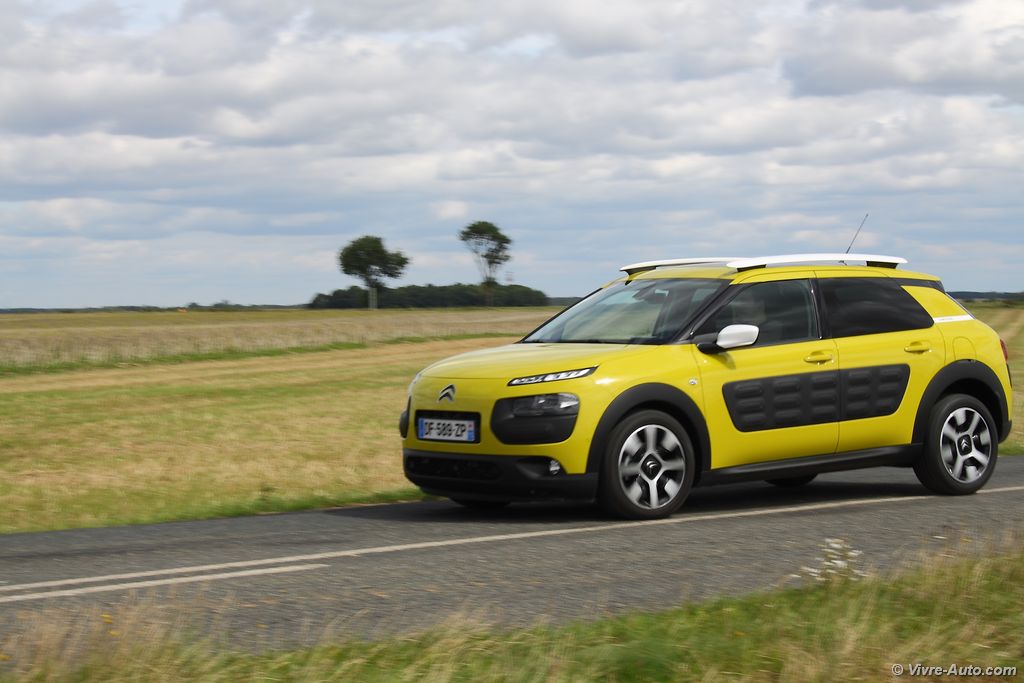 Le Citroën C4 Cactus est proposé avec trois moteurs essence, les PureTech de 75 ch, 82 ch, 110 ch et deux Diesel, HDi 92 ch et BlueHDi 100 ch. Notre essai s’est porté sur le PureTech 100 ch qui commence sa carrière chez PSA justement sur le Cactus. Ce bloc trois cylindres 1,2 l développe 110 ch à 5.500 tr/mn et un couple de 205 Nm à 1.500 tr/mn. Avec seulement 1.020 kilos sur la balance, notre modèle épineux est animé avec brio par cette motorisation. Le turbo délivre un couple suffisant dès le début de la courbe de régime et les reprises sont correctes malgré une boîte aux rapports longs. En ville comme sur route ce moteur nous a convaincus, et la surprise n’est pas finie. Annoncée à 4 l/100 km par le constructeur, la consommation moyenne de notre essai s’est révélée aux alentours de 6 l/100 km. C’est une excellente note au vu des performances. Seul bémol, le Stop&Start engendre quelques vibrations mais on s’y habitue vite. Qu’en est-il du comportement routier ? Encore une fois, grâce à sa modeste charge, notre Cactus s’est montré très agile avec très peu de roulis en virage. Bien sûr il ne s’agit pas d’un véhicule à connotation sportif et moins dynamique qu’un Peugeot 2008 mais pour autant sécurisant. Le freinage est bon et la direction très précise.