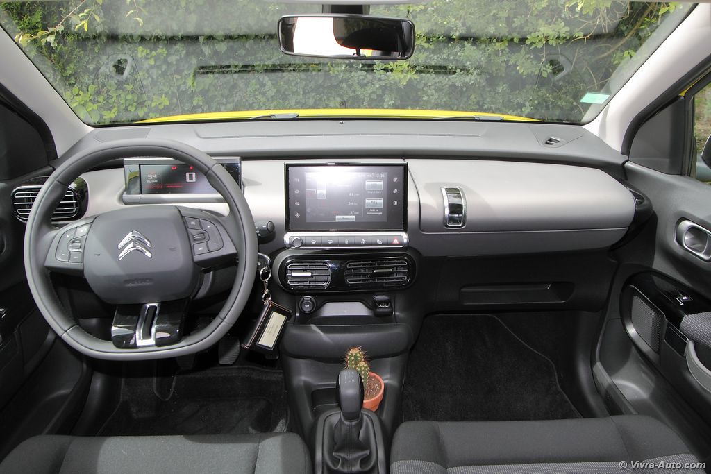 L’intérieur est tout aussi original. Les passagers sont accueillis par de larges sièges moelleux en velours très bien conçus. En version boîte automatique, ils se rejoignent façon banquette pour plus de convivialité. On ressent un sentiment d’espace à bord de ce Cactus. Très épurée et plutôt bien finie, la planche de bord accentue cette impression. Un grand écran tactile multimédia de 7 pouces livré de série sur tous les modèles regroupe l’ensemble des commandes audios, de navigation, des réglages véhicules et la climatisation. La planche de bord est ainsi épargnée d’une multitude de boutons et répond parfaitement à la question de la publicité « Pourquoi les tableaux de bord des voitures sont-ils si compliqués ? ». Mais lorsque vous devez régler l’air conditionné par exemple, il faudra quitter la route des yeux. Dépourvu de compte-tours, l’écran situé derrière le volant est très lisible. Plusieurs détails ne nous ont pas échappés, comme par exemple la