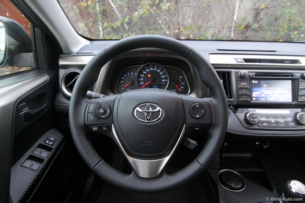 Essai Toyota Rav4 2,0l D-4D 124 - Vivre AutoA bord, la planche de bord confirme l’impression de robustesse évoquée précédemment. Structurée en deux étages, elle est visuellement très agréable. Sur notre modèle en finition Lounge, du simili cuir la recouvre et c’est plutôt réussi. On aime aussi les décors en imitation fibre de carbone, la présentation est vraiment soignée. En revanche on dénote encore beaucoup de plastiques durs notamment sur les contre portes, les assemblages sont cependant de bonne facture. Autre reproche, une ergonomie pas toujours au top, avec des boutons placés trop bas qui obligent à quitter la route des yeux, ou encore la navigation dans les menus du système multimédia qui manque de simplicité. On apprécie l’emplacement haut de ce dernier.