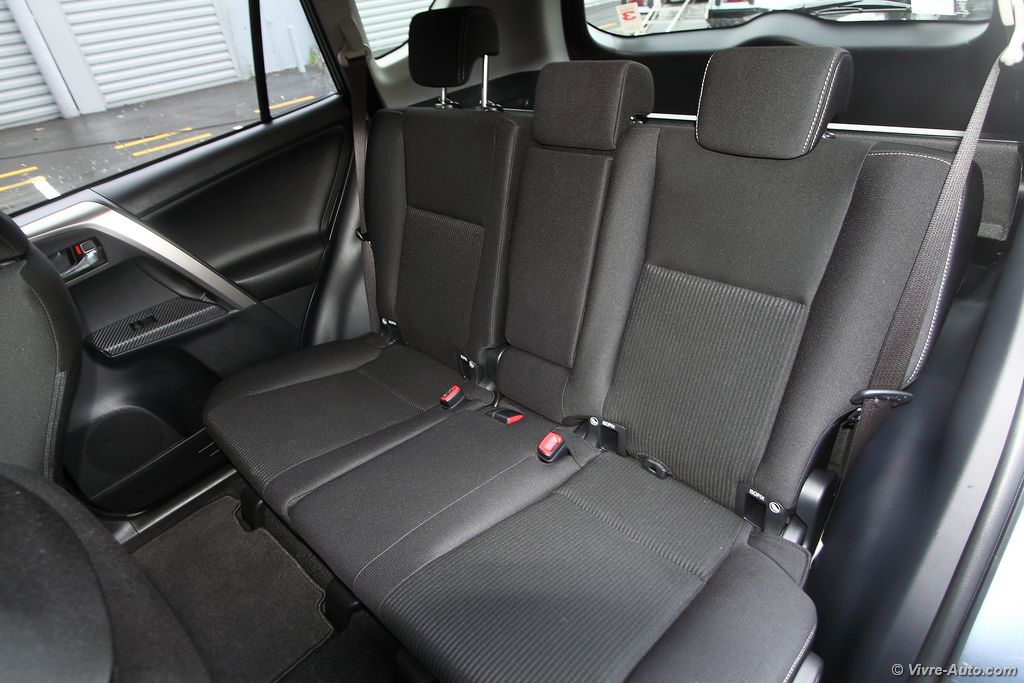 Essai Toyota Rav4 2,0l D-4D 124 - Vivre Auto Avec un empattement en hausse de 10 cm, l’espace à bord a beaucoup progressé, les passagers arrière disposent d’un bon dégagement pour les jambes d’autant plus que le tunnel de transmission est dissimulé. Les dossiers s’inclinent pour encore plus de confort. L’ouverture du coffre par une porte latérale, c’est fini ! Le SUV japonais adopte le hayon, à ouverture électrique dès le deuxième niveau de finition. Ce dernier libère une capacité de chargement très confortable de 547 litres, en haut de la catégorie. Une fois les sièges rabattus, facilement via une poignée, on obtient un plancher plat et un volume total de 1.746 litres. Des espaces de rangement supplémentaires sont placés sous le plancher (30 litres sur version dépourvue de roue de secours), et un filet permet de poser des objets horizontalement. Le RAV4 brille ainsi au chapitre contenance/modularité.