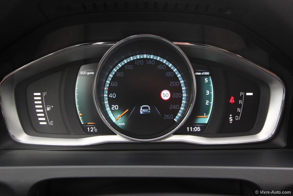 La présentation est très soignée avec des matériaux de haute qualité qui éveillent deux de nos sens, la vue et le toucher. Les sièges, plus enveloppants, sont très confortables, on trouve tout de suite sa position de conduite idéale, les appuis-têtes soutiennent parfaitement notre tête sans avoir besoin d’aller les chercher. Mention spéciale aussi pour le revêtement du volant qui se montre particulièrement flatteur au toucher. L’ensemble est raffiné et il n’y a nul doute que nous sommes assis dans un véhicule premium. L’ergonomie est bonne, malgré la multitude de boutons sur la console centrale, on n’est pas perdu car c’est bien étudié. Ce nouveau millésime ne se voit pas forcément au premier coup d’œil à l’intérieur. Mais en regardant de plus prêt on peut observer quelques modifications. A commencer par le rétroviseur sans encadrement, ça n’a l’air de rien mais visuellement c’est très réussi. De nouveaux boutons rotatifs sur la console ou encore le décor façon Piano black en noir laqué (option) présent sur notre modèle, attention toutefois aux rayures. Les compte-tours sont désormais numériques avec trois graphismes au choix, du rouge pour le dynamisme, de l’élégance ou un mode éco qui vous aident à adopter une conduite plus sobre. A l’usage, voyager à bord de cette S60 est un réel plaisir. En cette période, on apprécie le pare-brise, les sièges et le volant chauffant. Le système multimédia Sensus Connect et son écran de 7 pouces est très complet, il offre un lecteur DVD, le Bluetooth, les commandes vocales, une prise AUX et USB, 8 haut-parleur (180W) et le GPS. Ce dernier ne nous a pas posé de problème tout au long de l’essai, il est simple et clair. Sur autoroute il affiche les