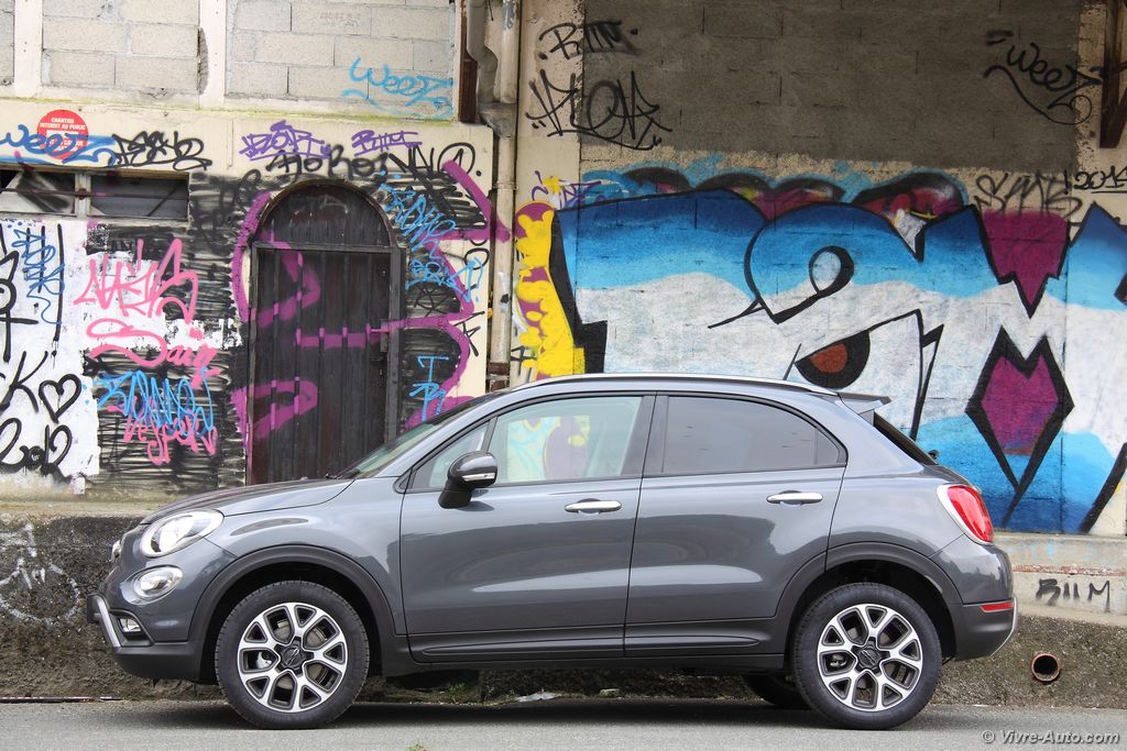 Essai de la Fiat 500X 1.6 Multijet 120 - Vivre Auto« Monsieur pilule bleue » comme mes voisins l’ont nommés lorsqu’ils l’ont aperçu, a très bien réussi son lancement marketing ! Il faut dire que son style est un des ses points forts, comme en témoigne le succès qu’il a obtenu lors de sa présentation au Mondial de Paris. Rien à voir donc avec le 500L, qui est plus une grosse caricature de la 500 traditionnelle et ne plait pas forcément à tout le monde. Ce 500X incarne parfaitement l’idée que l’on peut se faire d’un crossover, son style se caractérise par de bonnes proportions et on retrouve des éléments typiques de la petite 500 comme les phares ronds, la barre chromée autour du logo, son capot bosselé ou ses poignées de porte. Douze teintes de carrosserie et une quinzaine de jantes sont présentes au catalogue. Pour séduire un maximum de clients, l’italienne est proposée avec deux visages, urbain ou off road comme sur notre modèle d’essai. Cette déclinaison se distingue par des pare-chocs spéciaux intégrant des plaques de protection pour apporter un petit côté baroudeur. Côté dimensions, il est grand ce 500X, d’ailleurs si on le compare à ses concurrents directs, c’est le crossover compacte le plus long avec 4,25 mètres de long.