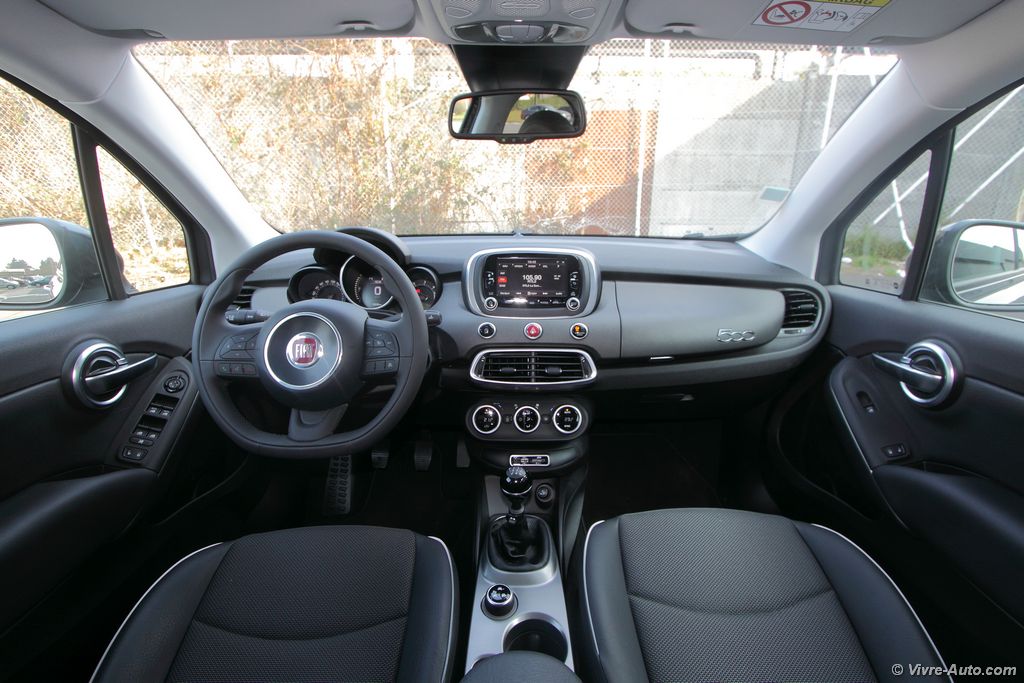 Essai de la Fiat 500X 1.6 Multijet 120 - Vivre AutoSurprise aussi pour l’intérieur ! La qualité des matériaux est en net progrès et la présentation est soignée. La partie supérieure de la planche de bord est même garnie de plastique moussé. Autre nouveauté, l’écran situé entre les compte-tours est bien plus moderne que les dernières productions du constructeur, fini donc l’affichage orange vieillot pour un écran couleur bien plus joli. En revanche il se montre bien trop complexe avec ses nombreux menus et sous menus et on s’y perd malgré les commandes au volant. Pour le reste l’ergonomie est plutôt bien pensée et on apprécie la disposition des commandes. La position de conduite est excellente, chacun trouvera son idéal. Essai de la Fiat 500X 1.6 Multijet 120 - Vivre AutoLe système multimédia UConnect et son écran tactile de 5 ou 6,5 pouces propose, selon les versions, un GPS 3D, une prise USB, une prise auxiliaire et le Bluetooth et son Streaming, compatible avec Deezer par exemple. Avec son grand gabarit, les passagers arrière profitent d’un bon espace, plutôt généreux pour la catégorie, un peu plus important que le Captur. En revanche grosse déception lors de l’ouverture du coffre, avec un volume de 350 litres de chargement, le 500X n’est pas le mieux classé. On apprécie cependant son hayon léger et la possibilité de replier le siège avant passager (option) pour charger des objets longs. A bord, les rangements sont nombreux à l’instar des deux boîtes à gants.