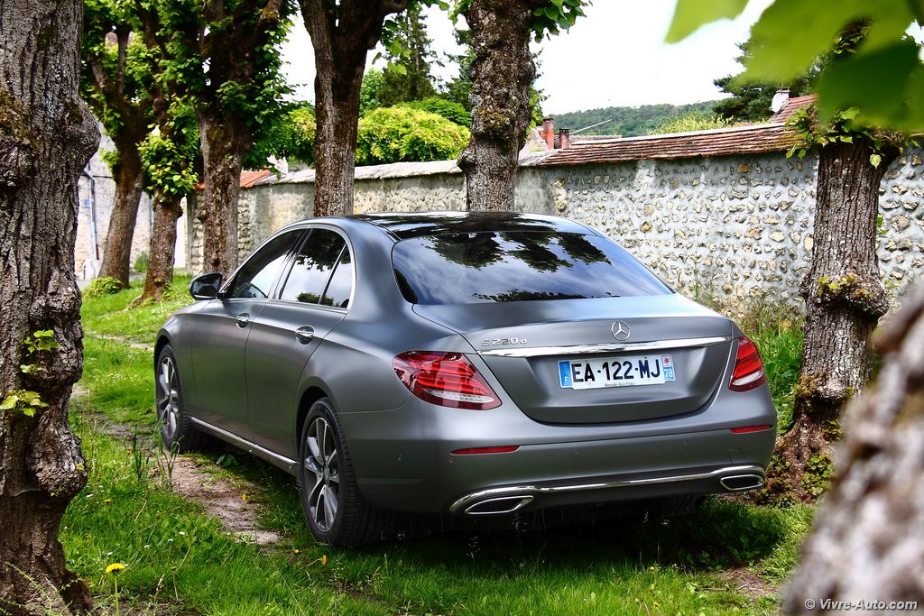 base, la calandre est classique avec trois barres centrales et l’étoile officie sur le capot. Dès le second niveau Executive, l’emblème déménage et vient s’installer au centre de la calandre qui perd au passage une barrette. L’avant dernier niveau Sportline ajoute du dynamisme avec un bouclier plus musclé (pack AMG Line) et des jantes de 19 pouces. Notre modèle était doté de la finition haute Fascination qui offre en série de belles jantes alliage de 18 pouces et les feux à LED. Vous l’aurez remarqué, la peinture est mat, il s’agit de la teinte Gris sélénite magno designo (2.300€), une couleur qui s’associe parfaitement à cette berline en ajoutant un brin d’exclusivité.