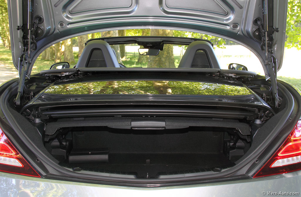 Pour rouler cheveux aux vent, rien de plus simple, il suffit d’actionner la commande dédiée à l’arrêt, la manœuvre demande environ 20 secondes et peut s’effectuer en roulant jusqu’à 40 km/h. Depuis le restylage, le cache-bagages s’abaisse automatiquement s’il n’est pas en place. Autre nouveauté, il est possible de remonter les vitres de custode arrière pour réduire les bruits de vent. Le SLC peut-être livré avec deux filets anti-remous amovibles, dont un est composé de deux panneaux transparents pour améliorer la visibilité.