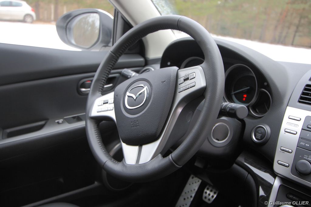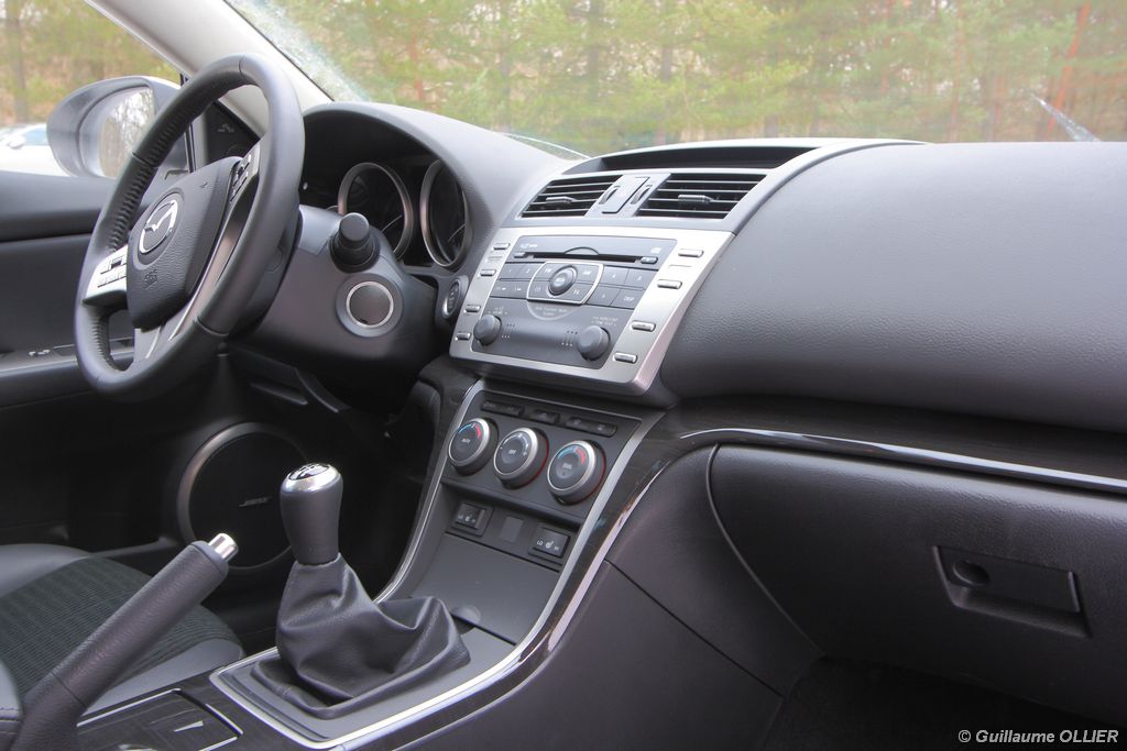 Notre modèle d’essai est doté de la finition « Sport », qui se situe au milieu de la gamme (Elégance, Sport, Performance), seul niveau disponible avec le 2.2 MZR-CD de 163 ch. Elle comprend énormément d’équipements en série comme l’alarme, les jantes alliage 18″, les radars de stationnement avant et arrière, le système de surveillance de la pression des pneus, la sellerie semi-cuir avec sièges chauffants, le démarrage sans clé, le kit mains libres Bluetooth, un chargeur 6 CD compatible MP3, la Hifi (système Bose 8 HP), et les phares avant Bi-Xénon auto adaptatifs ! Cette liste pléthorique est un bon point, sachant que la plupart de ces équipements ne sont disponibles en série que sur les finitions hautes de la concurrence, voir même proposés en option. L’intérieur de la Mazda 6 est bien fini malgré l’accumulation de plastiques durs. Il est d’ailleurs étonnant de constater la présence de plastique moussé uniquement sur la partie haute de la planche de bord, côté passager. Lors de notre essai, nous n’avons remarqué aucun bruit parasite. La présentation reste classique, mais l’association d’insert gris et de parties laquées est agréable. Quand les phares sont allumés, les compteurs sont entourés d’un éclairage circulaire bleu du plus bel effet. Le volant à trois branches est réglable en hauteur et en profondeur, il est recouvert de cuir. La commande du régulateur située sur la partie droite tombe tout juste sous la main, et s’avère pratique à l’usage, il est juste dommage de ne pas voir affiché quelque part un rappel de la vitesse enregistrée. Pour ce qui est de la partie gauche, elle commande le téléphone, les commandes vocales, et l’ordinateur de bord. Sur ce dernier l’ergonomie ne nous a pas convaincus, notamment pour consulter les différentes indications sur la consommation du moteur, ou encore pour changer de station de radio. Les sièges en semi-cuir sont assez confortables, on regrette juste un léger manque de maintien latéral.