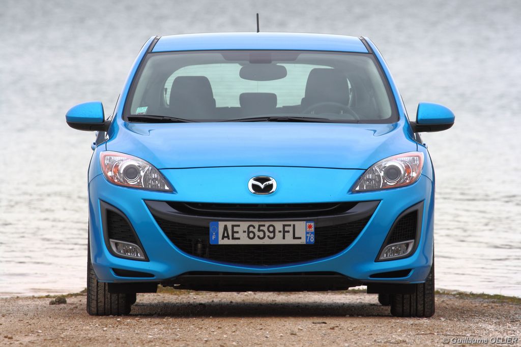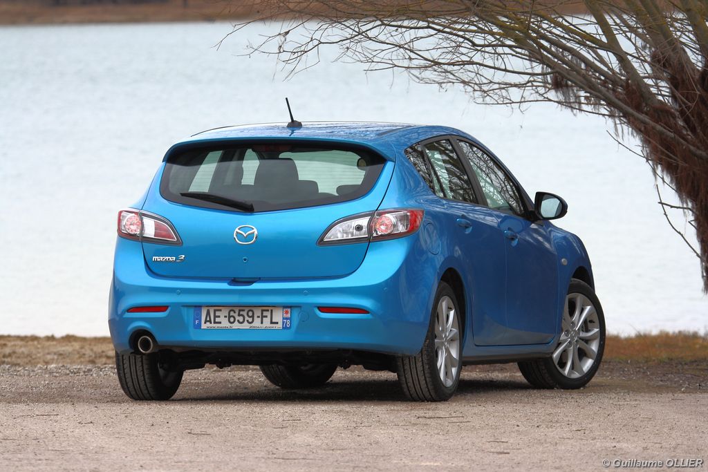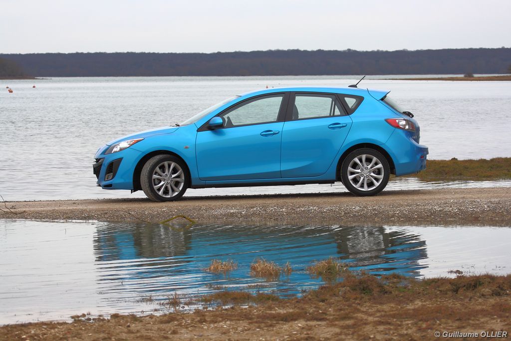 Notre version est dotée du plus puissant Diesel de la gamme 3. Ce bloc 4 cylindres 16 soupapes turbo Diesel Common rail est de dernière génération et répond aux normes Euro V. Avec 149 g de Co²/km, cette Mazda est dispensé de malus. Ce MZR-CD est-il aussi performant qu’il en a l’air ? Sur l’asphalte, la Mazda 3 est brillante d’efficacité. Souple et dynamique le moteur d’une cylindrée de 2 184 cm3 offre de belles performances. Le 0 à 100 km/h est abattu en 8,2 secondes, et la vitesse maximum atteint les 213 km/h. Le couple de 400 Nm se ressent dès les 1 800 tr/mn et reste très vigoureux au delà. En effet il est constant jusqu’à 3 500 tr/mn, où les 185 ch sont disponibles. Cette puissance associée au poids contenu de la voiture offre un très bon agrément de conduite. Mazda fait partie des constructeurs automobile qui allègent leurs véhicules au fur et à mesure des générations. Notre version pèse alors 1 465 kg sur la balance. De plus, son châssis typé sport offre d’excellentes sensations sur le bitume ! La boite de vitesse est parfaitement adaptée, elle renforce le plaisir de conduite. Sur autoroute en 6ème, il ne sera pas nécessaire de faire tomber un rapport pour passer de 90 km/h à 130 km/h par exemple. Les reprises sont d’autant plus que correctes ! De même les dépassements se réalisent très rapidement et en toute sécurité. En revanche, le levier de vitesse manque de souplesse même si le guidage est parfait. Question tenue de route, le châssis dynamique est en parfaite adéquation avec la puissance. Le train avant encaisse très bien les 400 Nm, et sur terrain mouillé, l’anti-patinage apporte son aide. Le freinage répond très bien, il est appréciable lors d’une conduite soutenue.