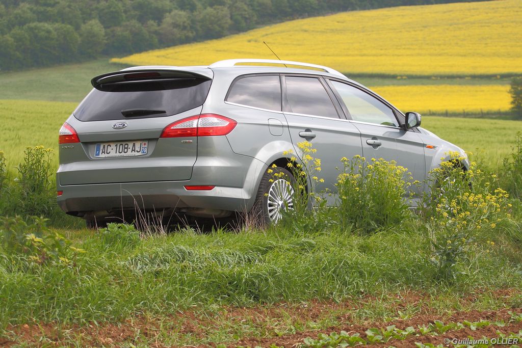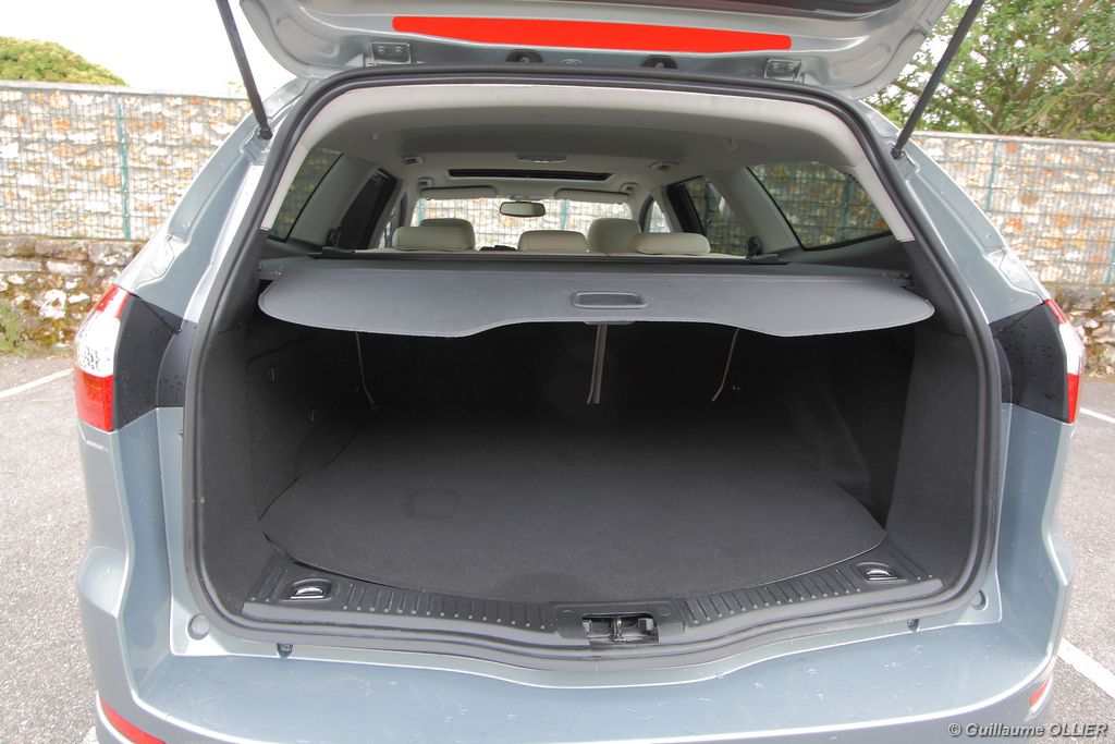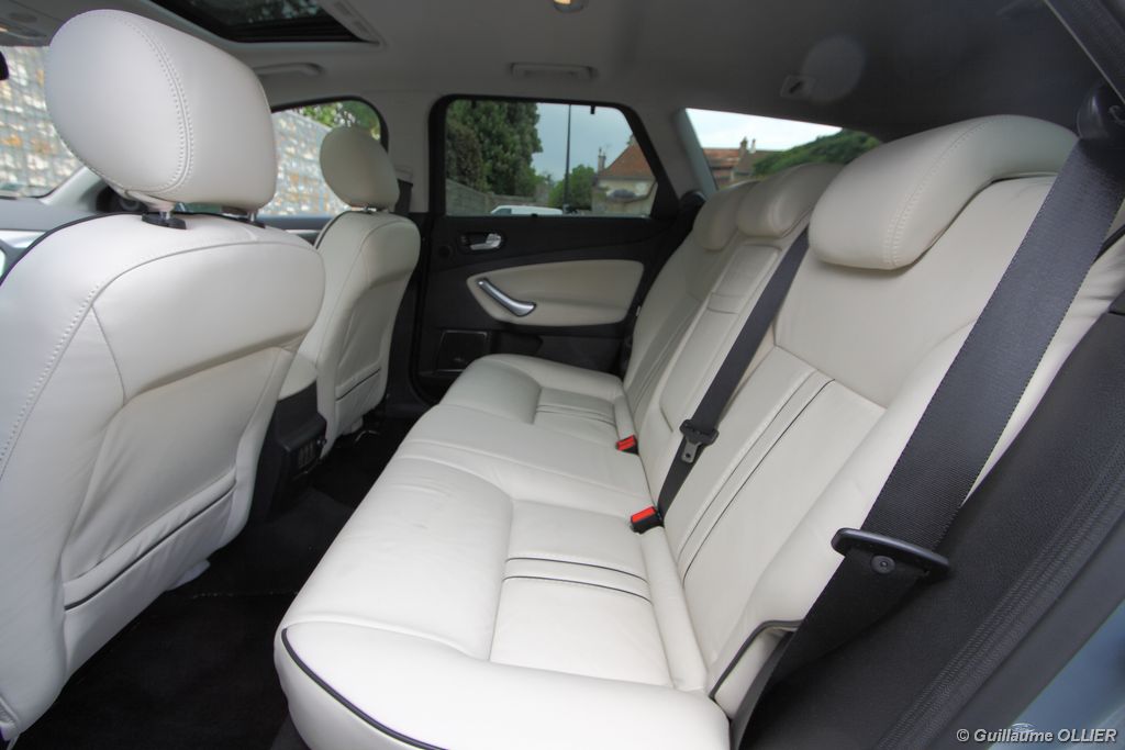vivre-auto-ford-mondeo-tdci-175-essai-19L’habitacle de la Mondeo est plutôt réussi. La console centrale et l’entourage du pommeau de vitesse ne font qu’un. Les matériaux employés sont globalement de bonne factures, mais nous aurions aimé des éléments imitation aluminium brossé à l’aspect un peu moins clinquant. De plus l’ajustage entre le support du levier de vitesse et le montant de la console centrale laisse à désirer. La visibilité de l’instrumentation est bonne mais nous aurions aimé des compteurs un peu plus originaux. L’habitacle de la Mondeo est plutôt réussi. La console centrale et l’entourage du pommeau de vitesse ne font qu’un. Les matériaux employés sont globalement de bonne factures, mais nous aurions aimé des éléments imitation aluminium brossé à l’aspect un peu moins clinquant. De plus l’ajustage entre le support du levier de vitesse et le montant de la console centrale laisse à désirer. La visibilité de l’instrumentation est bonne mais nous aurions aimé des compteurs un peu plus originaux.  Les sièges, très enveloppant sont joliment dessinés, et le confort est de rigueur. Ford à travaillé sur l’espace intérieur en concevant cette berline, cela se ressent. Les passagers arrière de grande taille apprécieront cet aspect puisque la garde au toit, l’espace aux jambes et la largeur aux coudes sont un plus. Ce grand confort est du en partie à l’empattement assez important. Les espaces de rangement sont nombreux, avec notamment une vaste boîte à gants. Le coffre est grand, et cette version Clipper est l’un des plus grands breaks du marché. Enfin, la visibilité est très correct, ce qui n’est pas forcément le cas de l’ensemble des breaks familiaux vendus sur le marché. Les manœuvres se réalisent ainsi sans craintes.