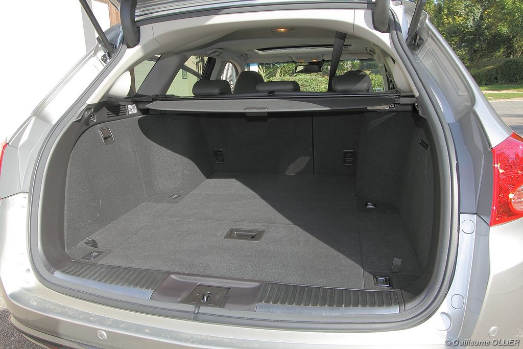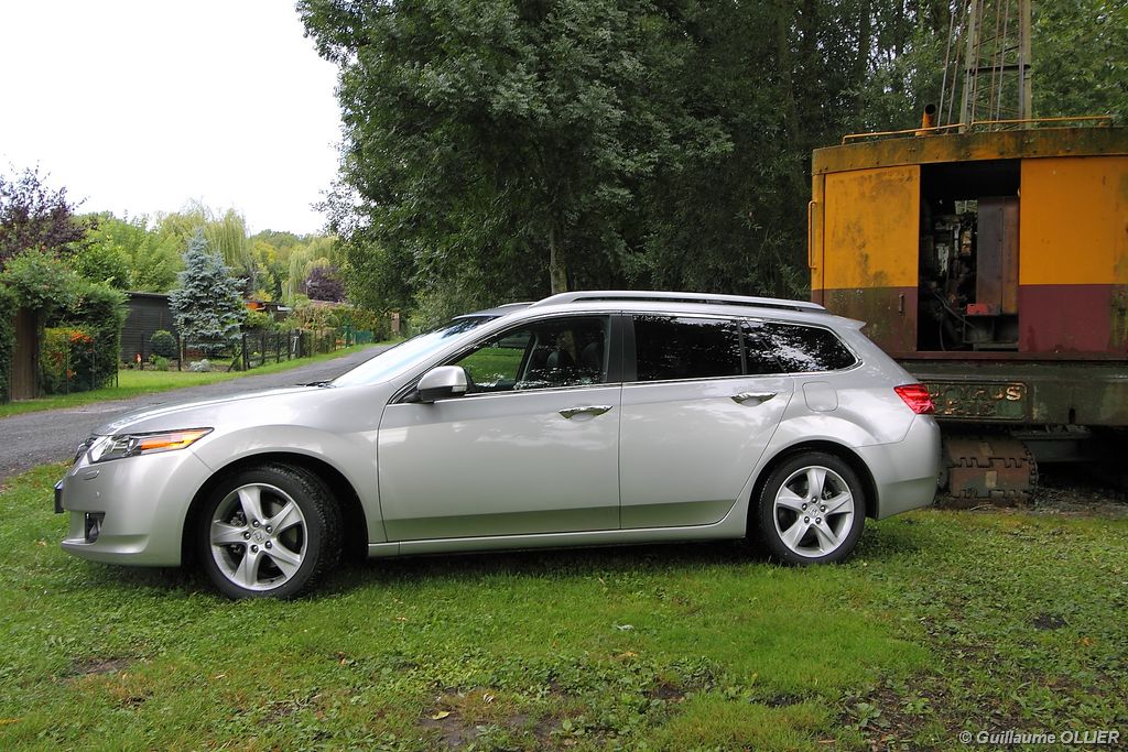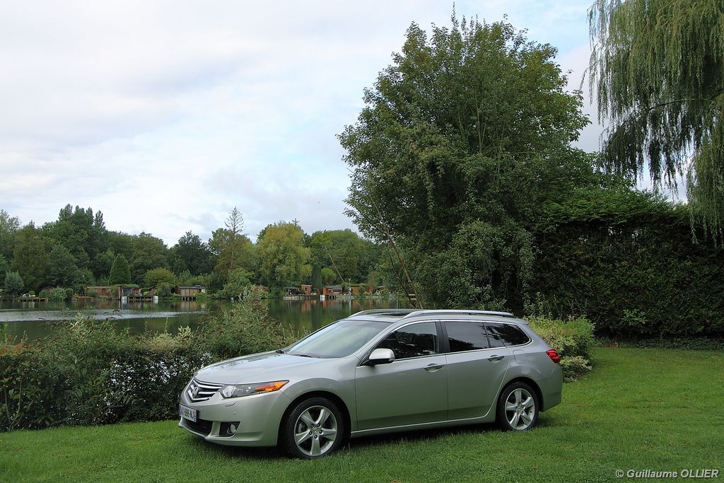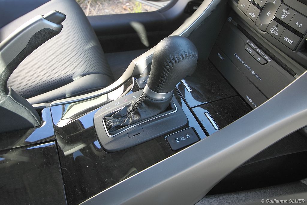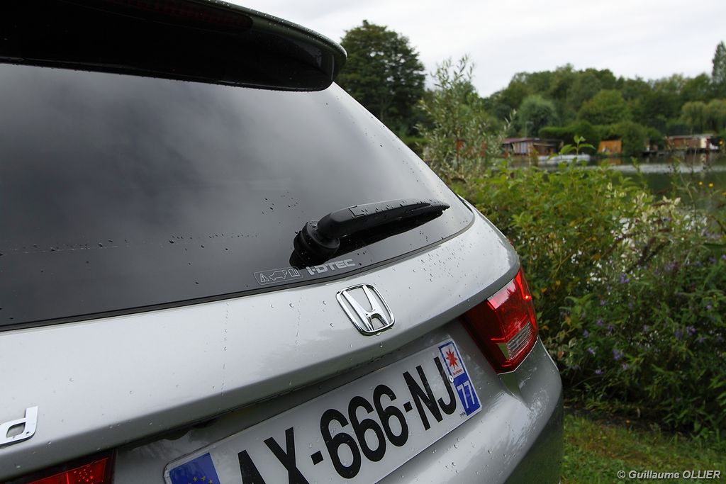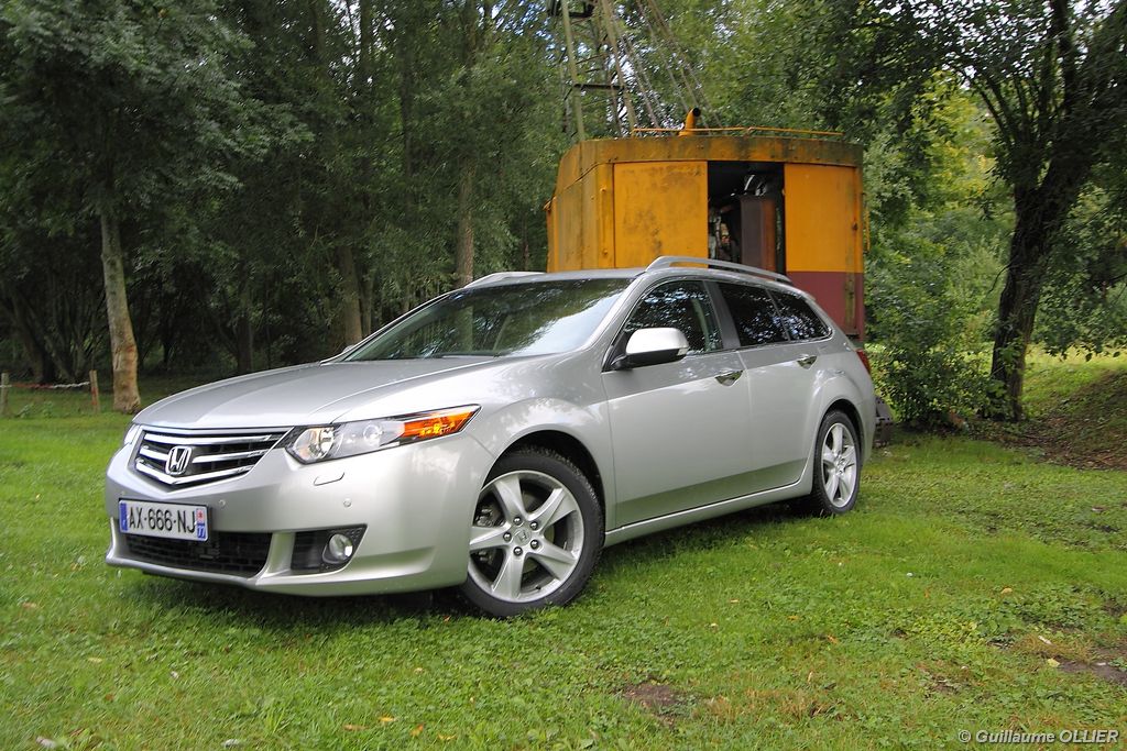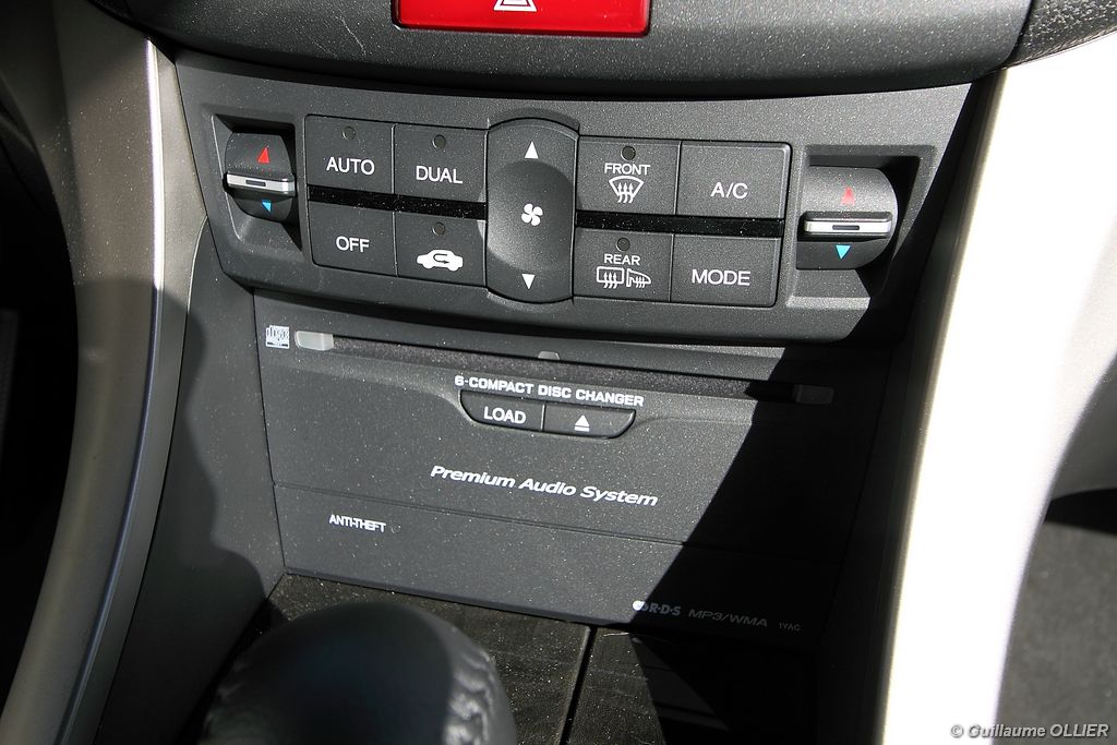 A l’intérieur rien ne change, et l’ambiance sportive est toujours présente. La qualité des matériaux est correcte, et l’ensemble ne souffre d’aucun reproche. L’ergonomie est bonne même si la profusion de boutons sur la planche de bord et sur le volant peut déstabiliser au début. Le GPS mériterait un rajeunissement, ne comptez pas sur lui pour vous indiquer les radars par exemple. Les sièges avant sont plutôt confortables, mais à l’arrière les places manquent de générosité, avec un tunnel central un peu trop massif. Les rangements dans l’habitacle sont nombreux : petit compartiment à côté du volant, pochettes sur les côtés de la console centrale, logement profond dans les portes avant, porte-gobelets sur la console centrale et dans l’accoudoir arrière, porte-bouteilles dans les panneaux de portes arrière. Sur le plan technologique Honda a greffé deux nouveaux équipements propre à l’éclairage sur sa familiale. Les nouveaux feux avant dorénavant bi-Xénon intègrent un éclairage actif d’intersection. Lorsque l’angle de rotation du volant dépasse les 90 degrés et si le véhicule roule en dessous de 35 km/h, un faisceau de lumière supplémentaire s’allume du côté en question. L’Accord dispose également des feux de route actifs, un système qui, à l’aide d’une caméra gère automatiquement le passage des feux de route en feux de croisement lorsqu‘un véhicule arrive en face.