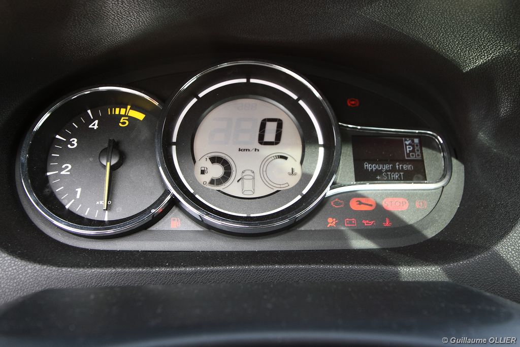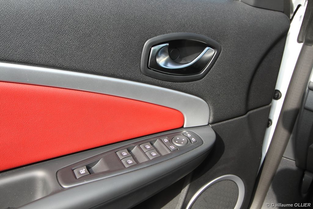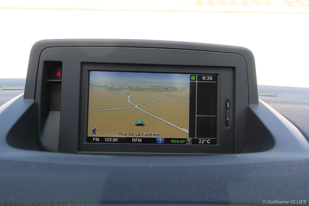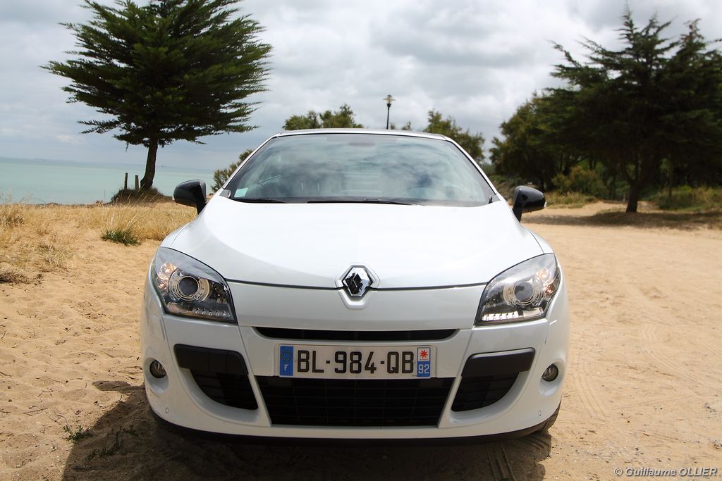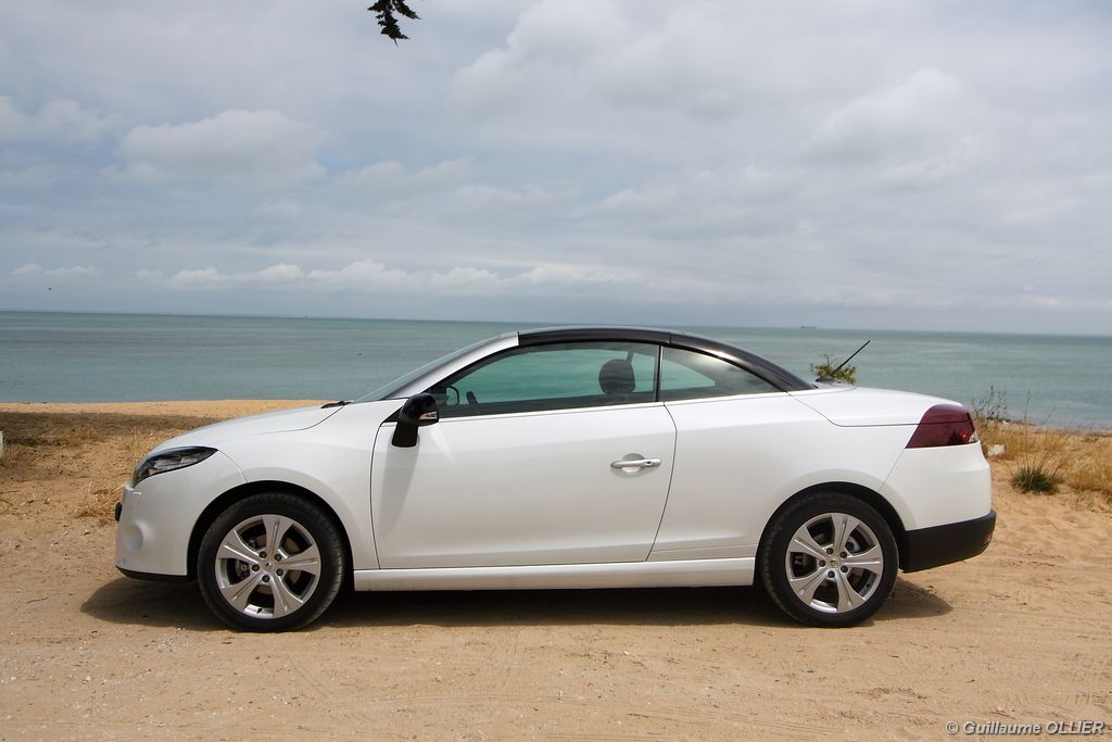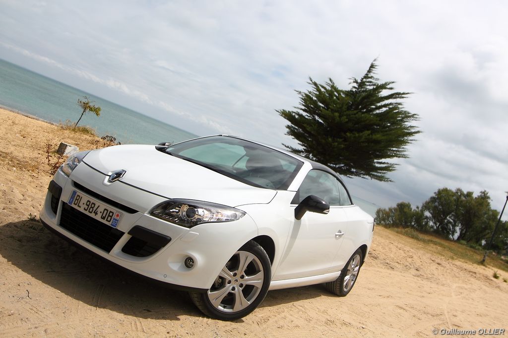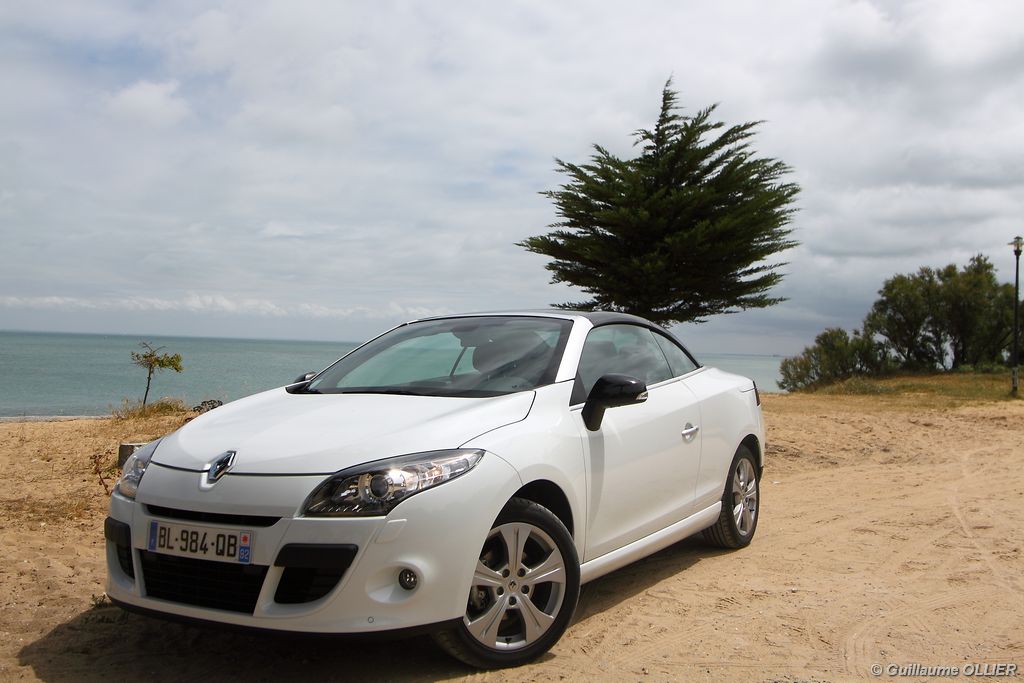 m². Les équipements sont complets, le frein de parking électrique et la carte main libre sont agréables au quotidien. Le GPS Tomtom se montre très pratique à l’usage, avec des menus intuitifs, et une molette de guidage est située prés de l’accoudoir central. Il affiche les limitations de vitesse, qui clignotent quand elles sont dépassées. Les radars fixes sont signalés par un bip sonore, à leur approche. L’option n’étant pas onéreuse (490€), elle est conseillée. Nous aurions préféré en revanche une ergonomie un peu plus simple notamment au niveau des commandes sous le volant. Les sièges sont confortables et offrent un bon maintien latéral. Les places arrière quant à elles sont généreuses, les passagers ne se plaindront pas des trajets sauf certainement pour les grands gabarits. La garde au toit étant toutefois correcte. Côté volume de chargement, le coffre offre 211 dm3 en configuration cabriolet, et lorsque le toit est fermé, on obtient une capacité de 417 dm3, ce qui est plus que dans une Mégane berline. Avec un seuil de chargement assez bas, l’accessibilité est appréciable. Enfin, d’une contenance de 9 litres, la boîte à gants se verrouille et se déverrouille en même temps que les ouvrants.