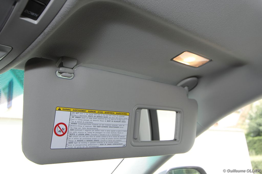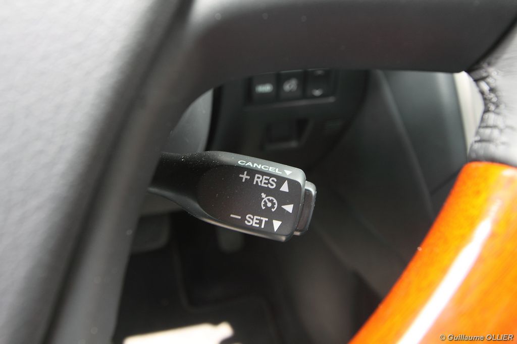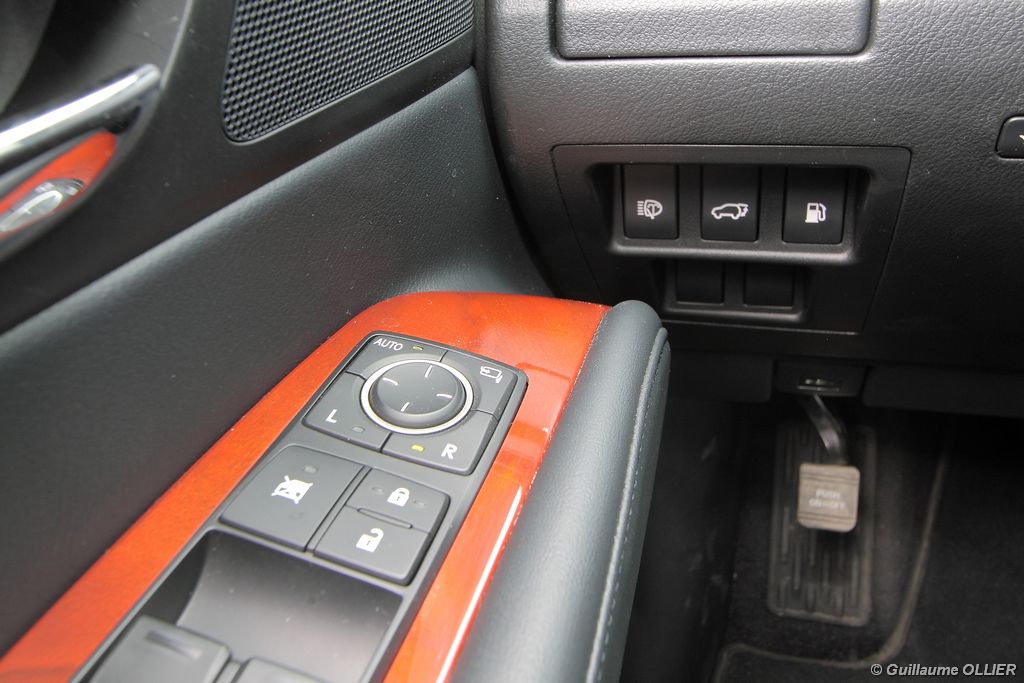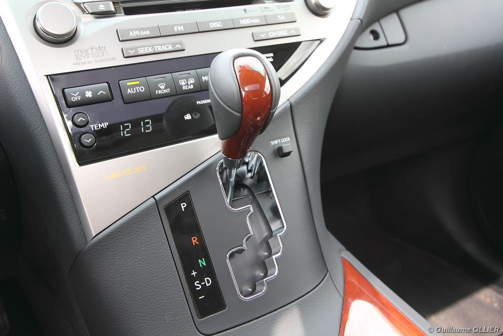 Sous le capot, on retrouve la deuxième génération du système Lexus Hybrid Drive. Deux moteurs électriques viennent compléter le V6 essence de 249 ch. Un à l’avant de 167 ch et un à l’arrière de 68 ch, ce dernier uniquement pour la version quatre roues motrices comme notre modèle. Ils fournissent de la puissance au moteur thermique lors des phases d’accélération, et ils se rechargent à l’aide du thermique et lors des décélérations. On obtient ainsi une puissance cumulée de 299 ch ! Au volant, les accélérations et reprises sont franches, et le tout agrémenté par une bonne sonorité. Les performances parlent d’elles mêmes, avec un 0 à 100 km/h abbatu en 7,8 secondes. En ville, on peut rouler jusqu’à 40 km/h en mode tout électrique sur une distance d’environ 3 km. Ceci permet de ne pas rejeter de CO2 mais aussi d’apprécier le silence de fonctionnement. Attention toutefois aux piétons. Le passage de l’électrique au thermique se fait sans s’en rendre compte. Le moteur est associé à une boîte de vitesse automatique à variation continue à six rapports. A la place d’un compte-tours classique, le RX 450h dispose d’un compteur qui vous informe sur le fonctionnement du système hybride. Il est partagé en trois zones, bleue lorsque la batterie se recharge, verte pendant une conduite « éco », et blanche lors des phases d’accélérations importantes. De plus un schéma entre les compteurs vous indique en temps réel le fonctionnement. Le conducteur peut aussi activer trois modes de conduites : « ECO », qui réajuste la commande du papillon du moteur et la climatisation, afin de réduire la consommation et les émissions. « EV », ce mode utilise uniquement les deux moteurs électriques, et « SNOW » permet au système hybride d’ajuster le couple aux quatre roues motrices sur route enneigée ou glissante par exemple. Le RX 450h, c’est seulement 148 g de rejet de CO2/ km ! Pour un SUV de 2,1 tonnes avec 299 ch sous le capot on ne peut que féliciter les ingénieurs. Nous avons ainsi parcouru plusieurs kilomètres en ville et en dehors pour vérifier les chiffres de consommations annoncées par le constructeur. Sur le papier, les moyennes sont les suivantes : 6,5l (urbaine), 6.0l (extra-urbaine), 6.3l (mixte). Après plusieurs kilomètres réalisés en