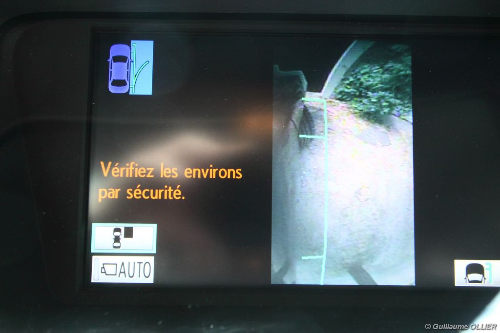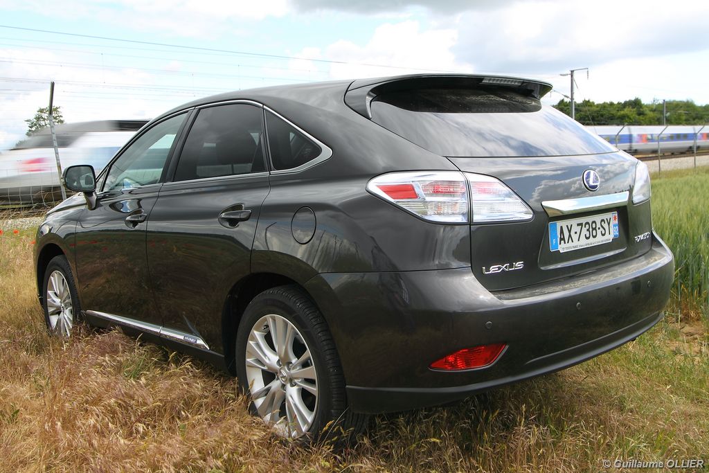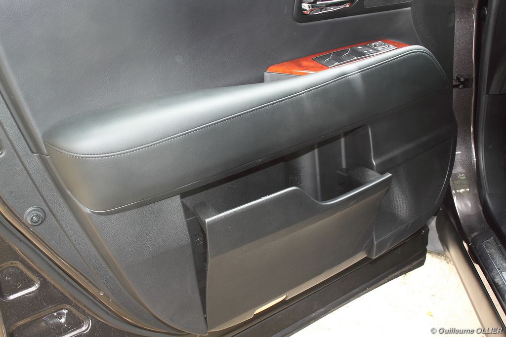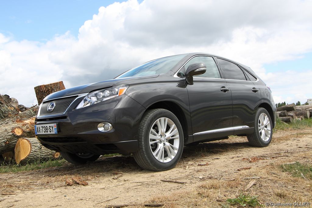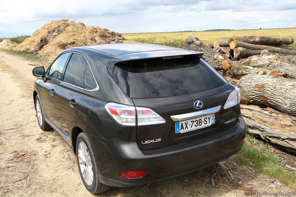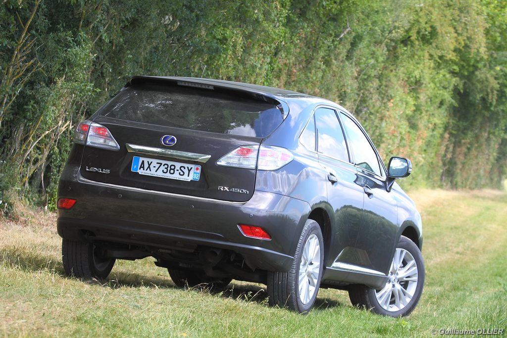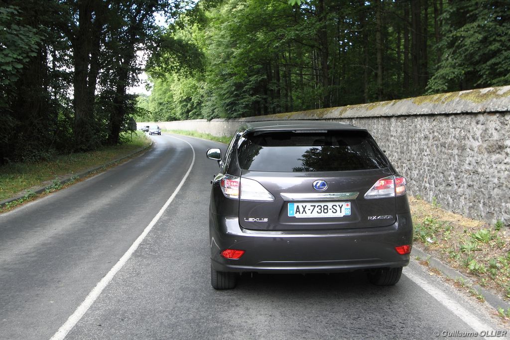 agglomération, notre moyenne établie était de 7l/100 km ! Nous avons même réussi à faire baisser cette donnée à 6,5 l/100 km. Sur route nous avons réalisé des moyennes de 7,5 l/100 km en empruntant des nationales, et des autoroutes. En somme quelque soit l’usage, le rapport consommation/poids/puissance bat des records ! Ainsi, avec un réservoir de 65 litres, vous obtenez une autonomie de prés de 900 km. L’amortissement typé ferme permet de contrôler le roulis et préserve la précision mais se montre également assez souple pour conserver un amortissement optimal. A noter qu’une suspension pneumatique à commande électronique est disponible en option. Le RX 450h peut ainsi parcourir des kilomètres sans que les passagers se plaignent du confort. Le comportement routier n’est pas si mauvais pour ce lourd SUV. L’ESP se montre efficace et va même jusqu’à arrêter le véhicule en cas de gros sous virage. Le freinage est endurant et ça freine court. En option deux équipements de sécurité sont proposées, un régulateur adaptatif (ACC), et un système d’assistance au freinage pré-collision qui utilise les freins avant un impact et rétracte les ceintures (PCS). Malgré son gabarit, le SUV nippon se manœuvre facilement. En plus de la caméra de recul, une caméra latérale avant droite préserve les jantes 19 pouces, elle est activable depuis le volant. Un accessoire fort utile encore peu rependu.