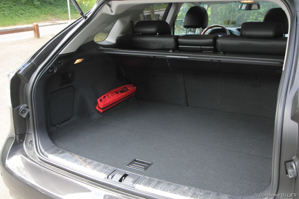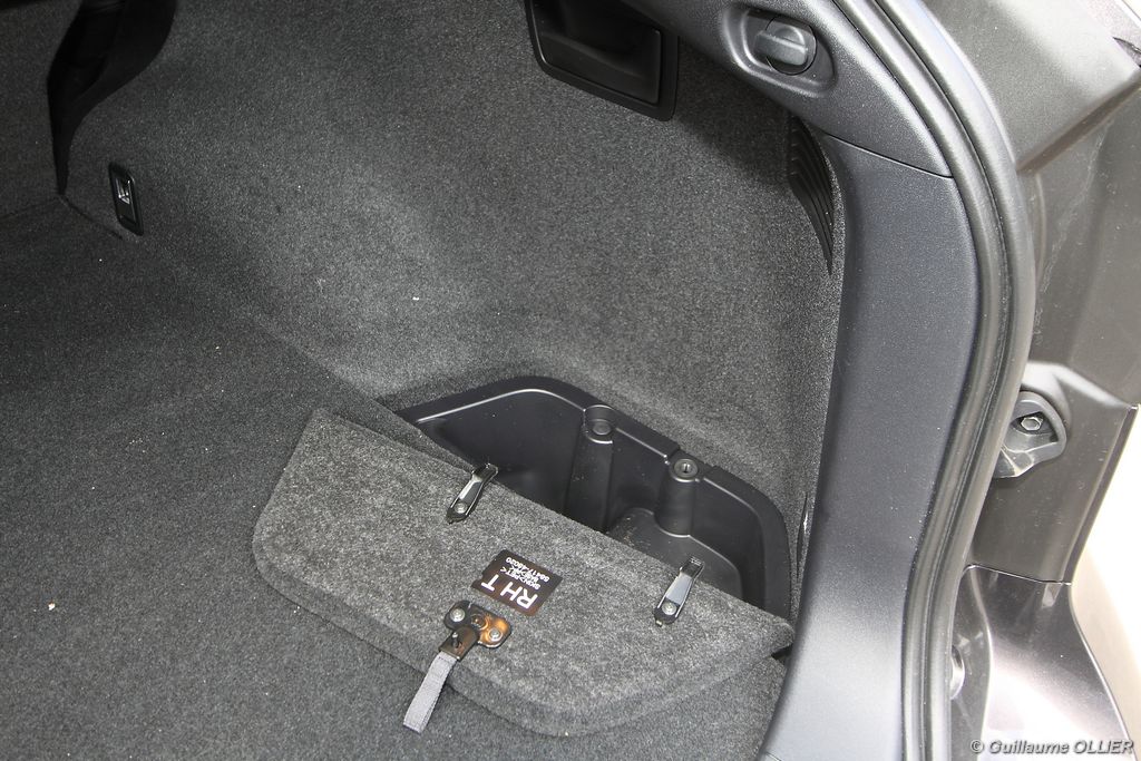 concentré sur la route puisqu’il indique la vitesse et les informations relatives au système audio. L’écran couleur LDC 8 pouces est complété par une commande multifonction « Remote Touch », autrement dit une sorte de joystick très ergonomique. Celle-ci vous permet de naviguer dans les différents menus et ainsi gérer la climatisation, la navigation, la téléphonie, la radio, un calendrier et même votre moyenne de consommation sous forme de graphique. Sans oublier les différents éléments d’entretien du véhicule, bref un ordinateur de bord plus que complet ! Le système Hi-fi Mark Levinson avec ses 15 hauts parleurs et son ampli de 100 watts nous a satisfaits, il dispose d’une prise USB compatible Ipod et il est doté d’un disque dur de 10 Go. Le GPS est assez intuitif, donc facile d’utilisation. Son graphisme est en revanche un peu dépassé. Globalement l’ergonomie est bonne et on apprécie la centralisation et le démarrage sans clé. Les passagers profitent d’un très bon niveau de confort à l’avant comme à l’arrière. Les multiples réglages de siège et de volant permettent de trouver une position de conduite idéale. Certains trouveront toutefois l’assise un peu trop haute. Les grands gabarits bénéficieront de l’aide à l’installation au poste de conduite, lorsque la porte est ouverte le volant et le siège conducteur électrique libèrent de la place. Les réglages peuvent être mémorisés jusqu’à trois combinaisons, même pour le passager ! Autre détail les sièges sont climatisés et chauffants. A l’arrière l’espace est de mise, les sièges coulissent longitudinalement et disposent de dossiers inclinables. La place du milieu est cependant étroite pour un adulte et le coffre n’accueille pas de siège supplémentaire comme le propose la concurrence. En dehors de ça, ce SUV est très confortable et soulignons que le cuir est d’excellente facture. Le coffre n’est pas pénalisé par l’emplacement des batteries puisqu’il offre un volume de chargement de 496 litres s’étendant jusqu’à 1 570 litres. La banquette se replie en trois parties, contrairement à la majorité des véhicules où seul deux éléments se replient. On gagne donc en modularité. Enfin, le hayon est électrique et peut s’actionner depuis le poste de conduite. Côté rangement, on retrouve de nombreux espaces accessibles au niveau des accoudoirs et sous la console centrale.