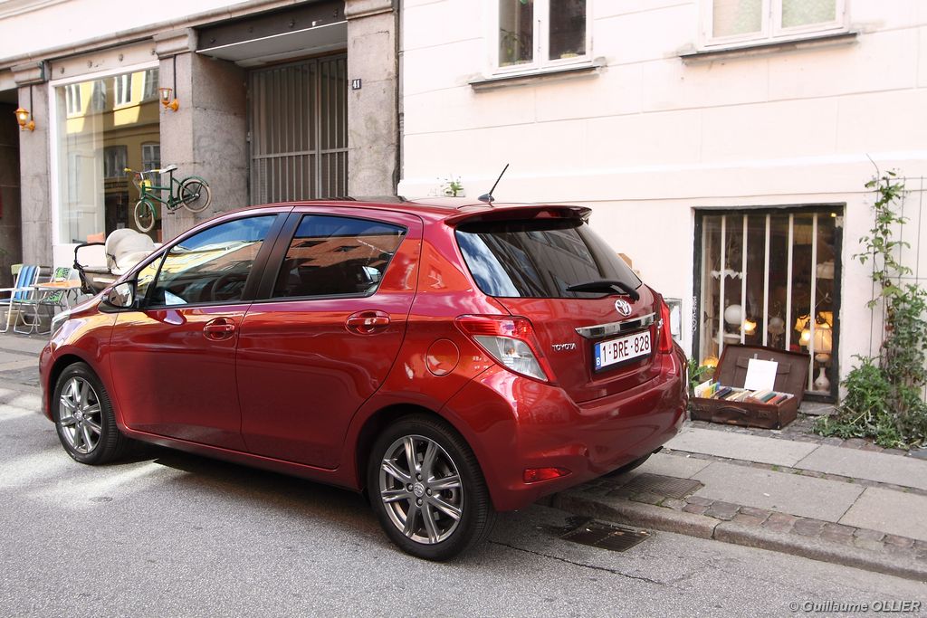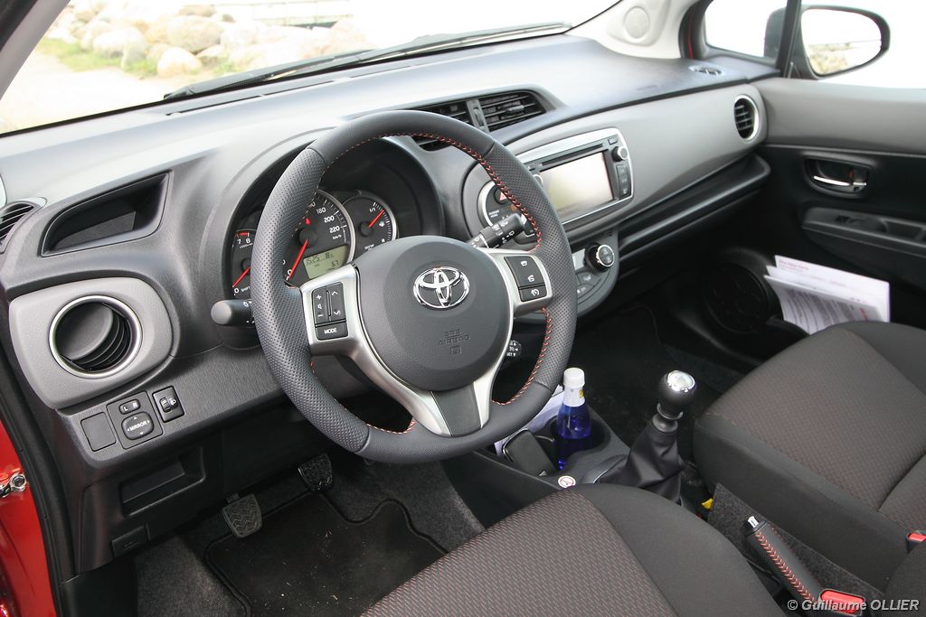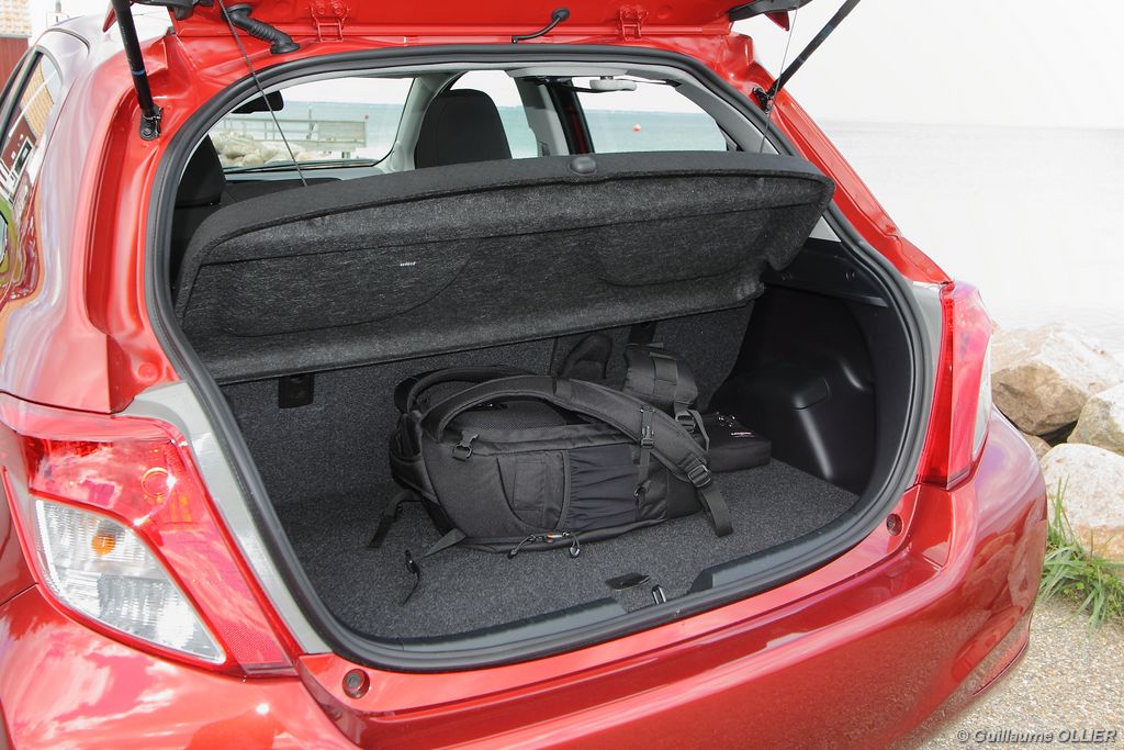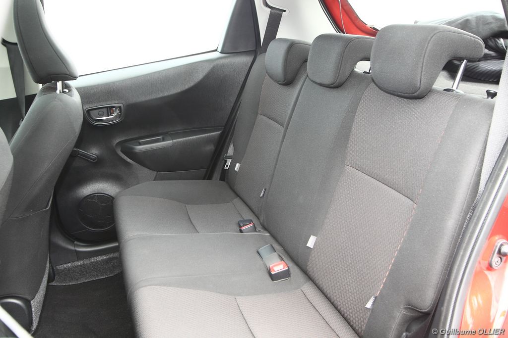 L’assemblage est toujours de bonne facture. Facturé 450€, le toit en verre panoramique renforce encore plus la bonne ambiance générale. Les compteurs sont bien lisibles, et l’ergonomie est dans l’ensemble bien étudiée, toutes les commandes tombent aisément sous la main. Le volant trois branches gainé de cuir surpiqué est agréable au toucher, et réglable en hauteur et en profondeur. La position de conduite est bonne, on regrette juste un léger manque de maintien latéral. Le gros point fort c’est l’écran tactile de 6,1 pouces intégré à la planche de bord, et livré de série sur toutes les finitions ! Très réactif, il permet de commander l’autoradio, et l’ordinateur de bord. Ce dernier se montre relativement complet, avec de multiples informations sur le véhicule, dont des statistiques sur la consommation de carburant sous forme de graphique. La qualité du son est bonne et dès le deuxième niveau de finition vous pouvez écouter vos musiques via le port USB compatible iPod, ou même en streaming Bluetooth. Lorsque vous enclenchez la marche arrière, une caméra de recul vous guide dans votre manœuvre, un équipement encore rare sur les citadines. La devise de Toyota pour cette nouvelle voiture est la suivante : compacte à l’extérieur mais spacieuse à l’intérieur. Vérifions. Avec un empattement allongé de 50 mm, l’aménagement de l’espace est amélioré. Les passagers arrière gagnent ainsi en confort avec un espace aux genoux augmenté de 30 mm et une assise longue de 865 mm, la meilleure mesure de la catégorie. Le coffre offre un volume de chargement de 286 litres ce qui reste dans la moyenne de la catégorie. A noter que la banquette arrière n’est plus coulissante, comme c’était le cas sur les anciennes générations. La cause ? Pouvoir stocker les batteries de la future version hybride dont la commercialisation interviendra l’année prochaine. Enfin, nous avons trouvé que les espaces de rangement avaient diminué. Bacs de portières minuscules, une seule boîte à gants contre deux précédemment, et bien trop petite. La sécurité et le nouveau système multimédia doivent y être pour quelque chose…
