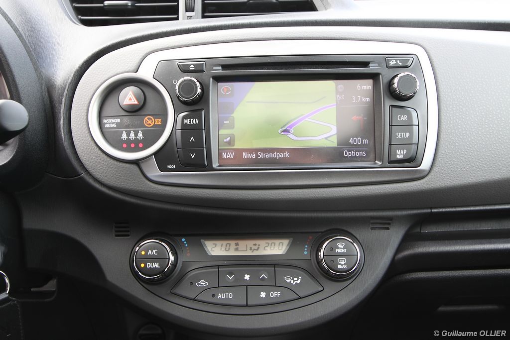 La nouvelle Toyota Yaris embarque un nouveau système multimédia inédit. Baptisé Touch&Go, cet équipement utilise l’écran tactile et regroupe un GPS Europe, et l’accès à internet via un téléphone mobile. C’est plutôt inédit pour une citadine ! Tout d’abord, le GPS se commande très facilement et présente un affichage de qualité. Il indique les limitations de vitesse, avertit les dépassements, et prévient de la présence des radars fixes. Nous n’avons pas de reproche particulier à lui faire et nous vous le conseillons grandement ! Ensuite, le système est capable d’utiliser votre téléphone pour se connecter à Internet et vous apporter diverses informations. Tout d’abord la recherche locale Google, elle consiste à vous indiquer sur le GPS un ou plusieurs lieux autour de vous à partir d’un mot. Par exemple si vous tapez le nom d’une chaine de magasin, vous obtiendrez l’itinéraire vers le magasin le plus proche. Des applications sont également téléchargeables comme la météo, les prix des carburants, la disponibilité des places de parking ou même Facebook… Pour utiliser cette fonction, en plus de l’accès à internet dans votre forfait, l’option usage modem doit être activée ce qui nécessite un coût supplémentaire. Toyota est par ailleurs en cours de négociation auprès des opérateurs pour faire baisser les tarifs des options pour moins de 5€ par mois. Le Touch&Go est facturé seulement 600€, une modeste somme. Le TomTom de Renault est ainsi détrôné (610€ pour la cartographie Europe) ! De plus, pour les six premiers mois du lancement de sa nouvelle citadine, le constructeur offre l’option aux clients.