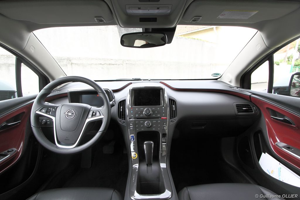 Ces chiffres sont-ils vraiment la réalité ? Et bien oui. Sur plusieurs parcours d’environ 70 km, nous avons obtenu une moyenne de 50 km avant que le moteur thermique s’enclenche. Son fonctionnement représentait un peu plus d’un quart du parcours, soit une consommation total d’essence de 2 litres. Notre meilleure performance fut 67 km en tout électrique. Le réservoir de 35 litres permet ainsi de réaliser environ 400 km supplémentaires. Notons également qu’à l’inverse d’une voiture thermique classique, l’Opel Ampera utilisera plus d’énergie sur route que dans les bouchons ou en ville, de quoi satisfaire beaucoup d’automobilistes. L’ordinateur de bord regroupe toutes les informations nécessaires à la durée de la batterie et à l’énergie utilisée.