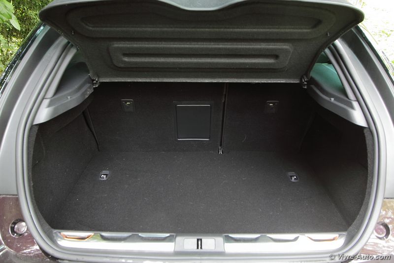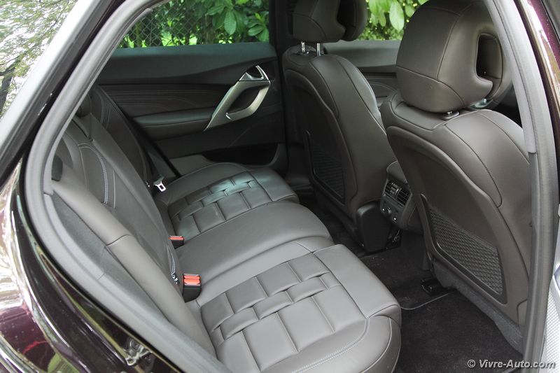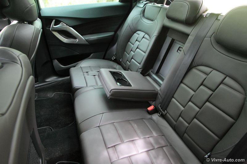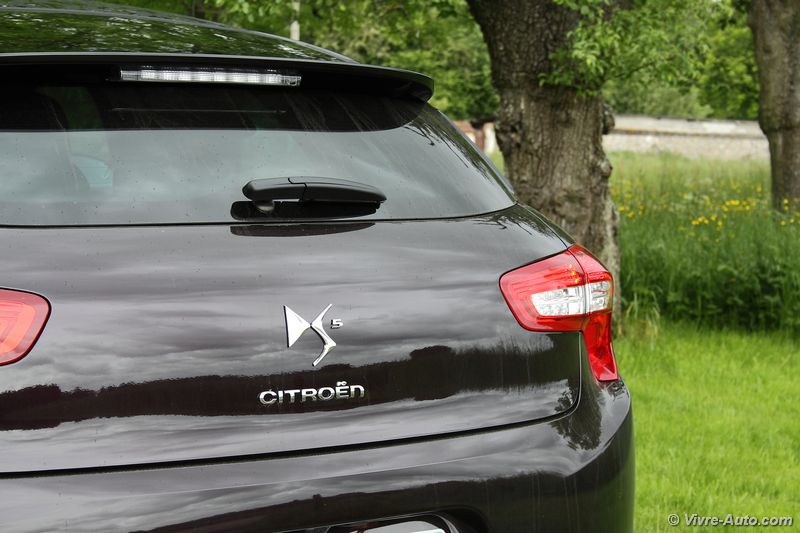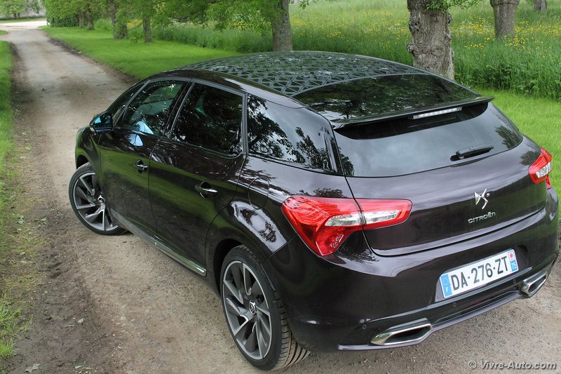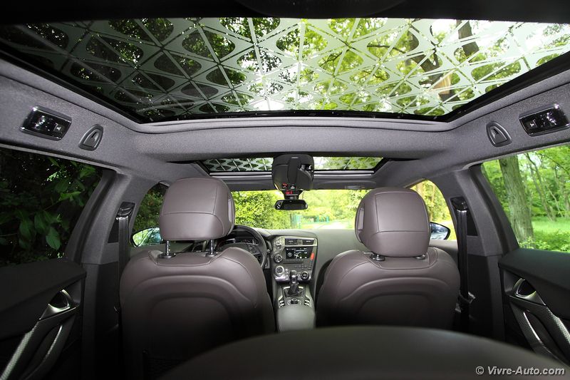 deux compartiments individuels pour les lunettes, par exemple. A l’arrière, les passagers disposent eux aussi d’un toit panoramique, l’espace aux jambes est tout à fait raisonnable mais la garde au toit un peu juste pour les grand gabarits. Comme à l’avant, les commandes de vitres se situent entre les deux sièges et non sur les portes. Enfin, notre modèle était dotée de la sellerie cuir semi-aniline Criollo en forme de bracelet de montre du plus bel effet et surtout très confortable ! Mais en option à 1.710€. Le coffre offre un volume de chargement de 468 litres, suffisant pour contenir plusieurs bagages. Au chapitre des équipements, la DS5 embarque tout le nécessaire d’une berline haut de gamme ou presque. Affichage tête haute, caméra de recul, alerte de franchissement de ligne, feux de route automatiques, prise 230 volt, Wifi On Board (via une connexion 3G), GPS avec vision 3D, sono HiFi Denon, siège conducteur massant. Mais il manque par exemple la détection des angles morts, la lecture des panneaux, le régulateur de vitesse adaptatif ou encore un système anti-collision pour être au top ! Autre remarque, la visibilité arrière est quasiment nulle, privilégiez donc les radars de stationnement ou la caméra de recul.