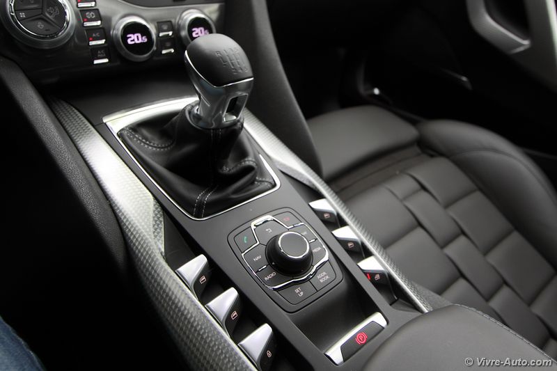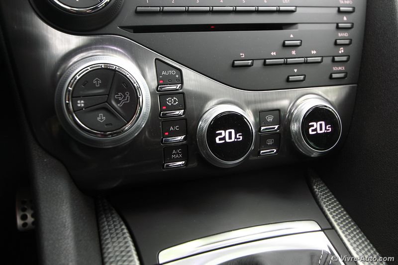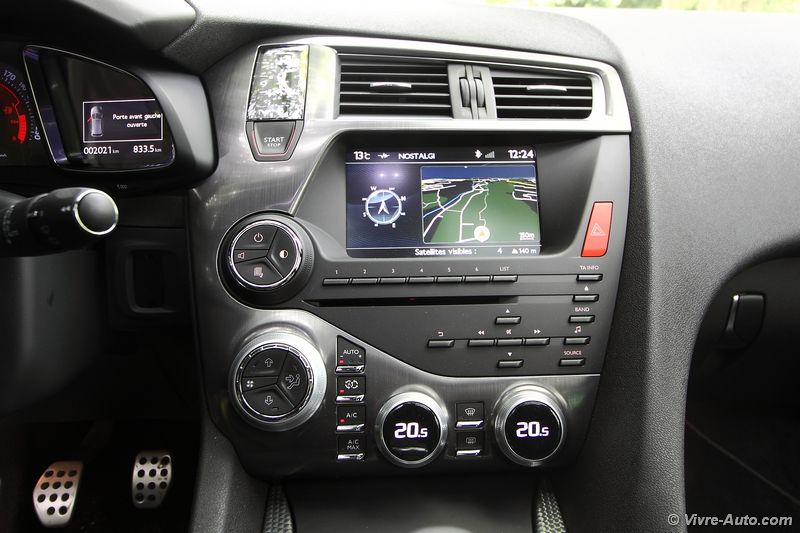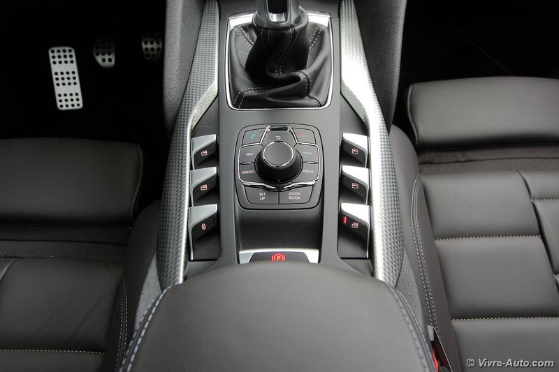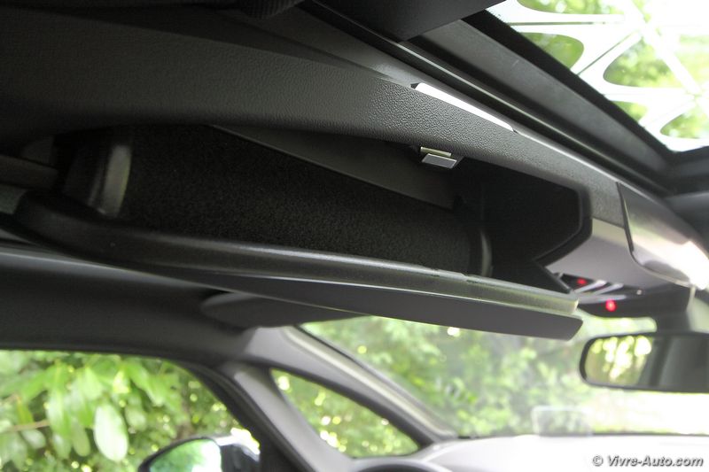 Original à l’extérieur, l’intérieur n’en est pas moins avec un thème principal : l’aviation. Même si le 3008 employait également quelques éléments de cet univers, la DS5 en fait un peu plus ! Au programme, deux toits panoramiques de chaque côté, des boutons types « toogle switches » sur le plafonnier et sur la console centrale qui permettent de commander les vitres, les stores et l’affichage tête haute. Ce dernier est en couleur et regroupe les informations suivantes : vitesse, régulateur/limitateur et navigation. Les compte-tours numériques sont très visible et font leur petit effet. La finition et les assemblages sont très sérieux, on s ‘étonne juste de voir une partie audio pas du tout en accord avec le reste et plutôt ancien que futuriste. C’est un détail car l’ensemble est très plaisant, et on se sent bien à bord ! Côté rangements, en revanche, c’est plutôt pauvre à l’instar d’une boîte à gant minuscule et du levier de vitesse qui arrive juste au niveau de la console centrale, bien placé au passage. Utilisateur de smartphone, pensez au support ! Le plafonnier, quant à lui, intègre