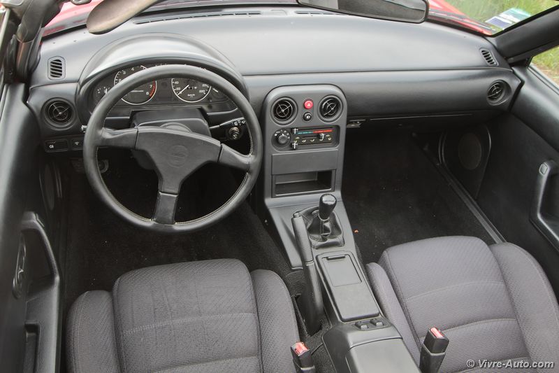 l’autoradio et honnêtement on s’en passe sans problème tant le chant du quatre cylindre est un régal pour les oreilles. Seul deux boutons sont disposés sur la console centrale, les warning, et la commande d’ouverture des phares escamotables. Ils se déploient instantanément , et ça fonctionne aussi lors d’un appel de phare ! Le MX-5 NA était disponible en deux versions, la première avec un hard top, c’était plus sécurisant et silencieux, mais il fallait être deux pour l’enlever. Ou alors, comme sur notre version, un toit en toile. Il se déplie et se replie très facilement avec deux leviers dissimulés sous les pares-soleil, et cela ne change en rien le volume du coffre. Ce dernier peut accueillir une valise et c’est tout, la roue de secours prenant déjà une place importante. Mais pour les longs voyages, un cache bagage peut se fixer sur la malle.