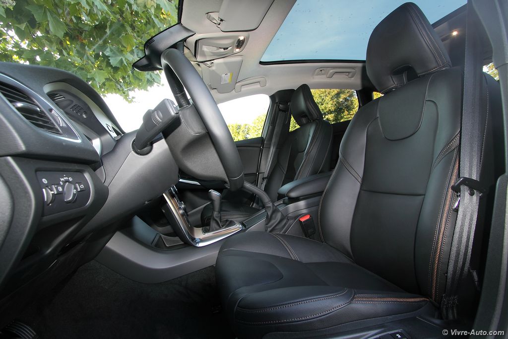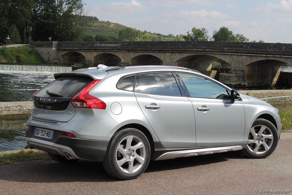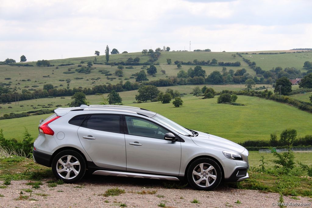 A bord, la qualité des matériaux est irréprochable, encore une fois la firme suédoise ne nous déçoit pas, nous sommes bien en présence d’un véhicule premium. La console centrale flottante de notre modèle était garnie d’incrustations en Aluminium Cuivré du plus bel effet, couleur que l’on retrouve également sur les surpiqûres des sièges en cuir. C’est un détail mais cela à son charme. Pour l’ergonomie, les différentes commandes tombent aisément sous la main, mention spécial pour le système multimédia et le GPS dont la navigation dans les menus est relativement simple. Le combiné d’instrumentation offre trois décors et se montre très lisible. Le conducteur trouve sa position de conduite idéale grâce aux différents réglages du siège. Ce dernier, plutôt enveloppant offre confort et maintien latéral. La déclinaison Cross Country n’apporte rien de plus à cet intérieur si ce n’est le nom incrusté sur la baguette de la boîte à gants. A l’arrière, l’espace offert aux occupants est correct, sauf pour le passager du milieu. Le coffre n’évolue pas, hormis un seuil de chargement plus haut, il libère toujours 335 litres d’espace de stockage, un chiffre des plus bas pour la catégorie. Heureusement, l’habitabilité est fonctionnelle avec une banquette rabattable en 40/60, des rails de plancher et un siège avant passager qui se rabat. Enfin, après plusieurs centaines de kilomètres, on constate qu’aucun bruit parasite ne se fait entendre.