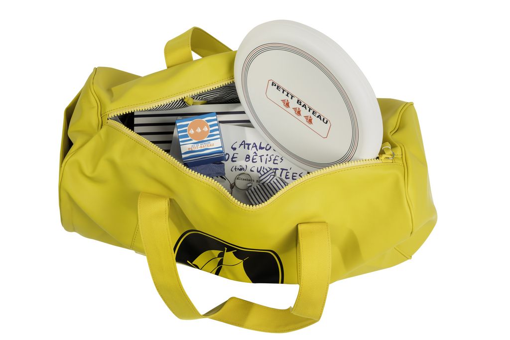 Un cadeau vous sera offert, sac ciré jaune contenant un porte-clés en forme de marinière, un catalogue de bêtises (très) culottées, un album photo, un jeu memory constitué d’images d’archives de Petit Bateau des années 60, un frisbee et un bon d’achat Petit Bateau de 250 euros.