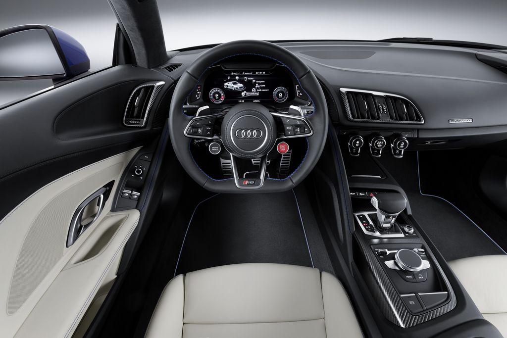 Cette sportive embarque un V10 atmosphérique de 5,2 l décliné en deux puissances. La R8 V10 développe ainsi 540 ch à 6.500 tr/mn et un couple de 540 Nm. Les performances sont au rendez-vous avec un 0 à 100 km/h réalisé en 3,5 secondes (0 à 200 km/h en 9,9 secondes) et une vitesse maximale de 323 km/h. La R8 V10 Plus, affiche, quant à elle, 610 ch et 560 Nm pour une vitesse maximale de 330 km/h et un 0 à 100 km en 3,2 secondes. Les deux versions sont associées pour l’instant à la boîte S-Tronic à sept rapports, couplée à un embrayage qui transmet le couple aux train avant et arrière ou indépendamment. Pour réduire les consommations, elle dispose d’un mode roue libre qui s’enclenche jusqu’à 55 km/h lorsque le conducteur relâche la pédale.