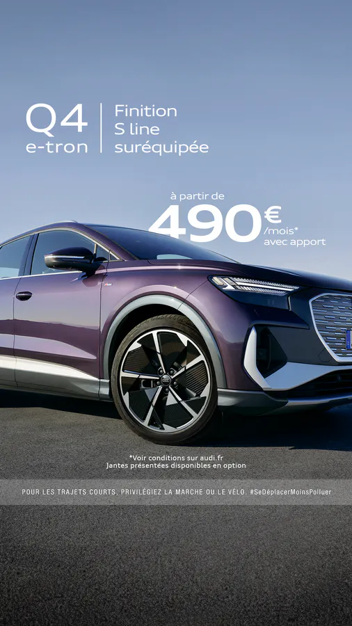Grâce à ces cumuls, Audi propose désormais son Q4 e-tron 45 Pack S line à partir de 490 € / mois (en LLD 37 mois après un apport de 2 700 €), renforçant ainsi sa compétitivité face à une concurrence de plus en plus agressive.