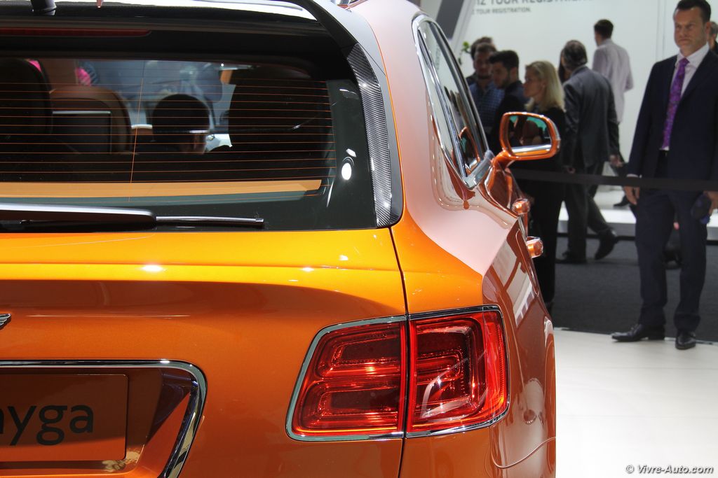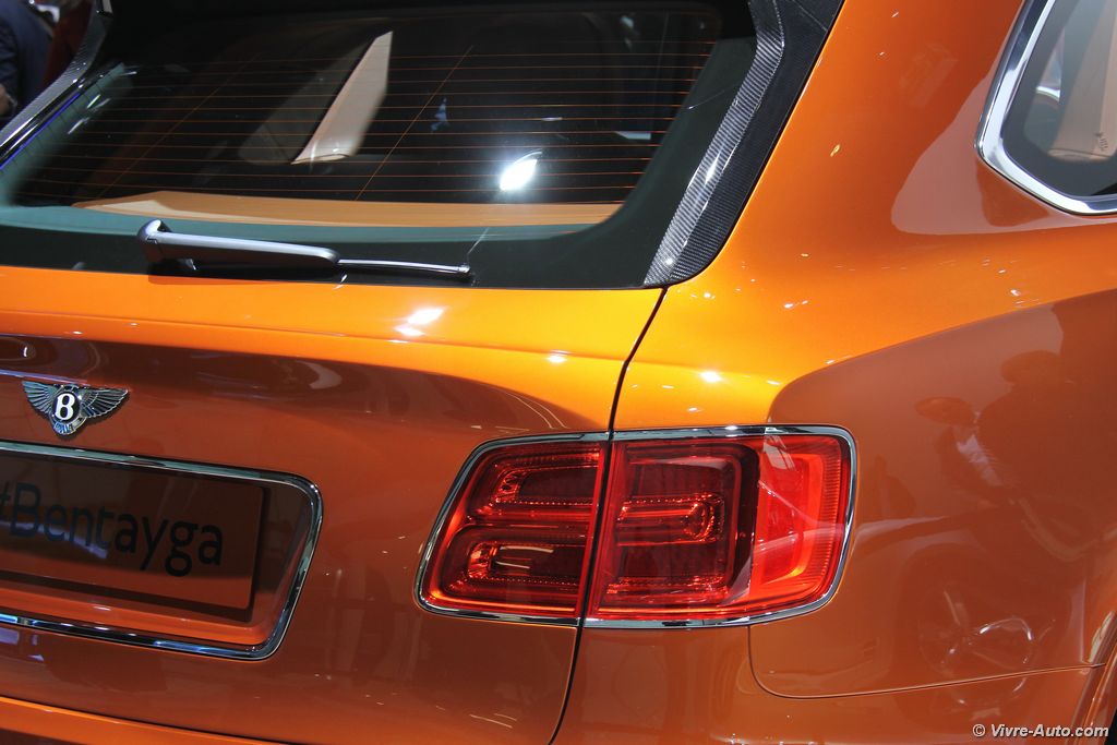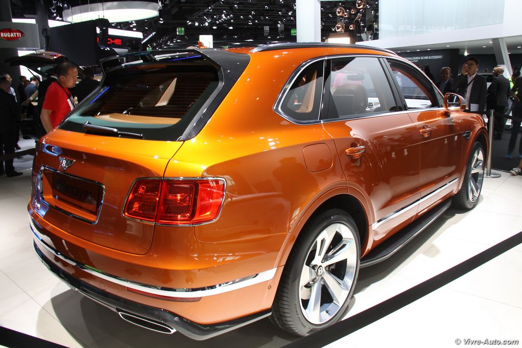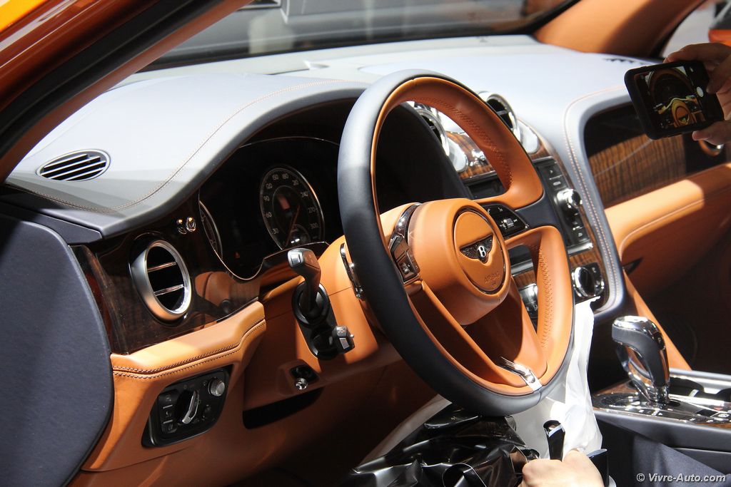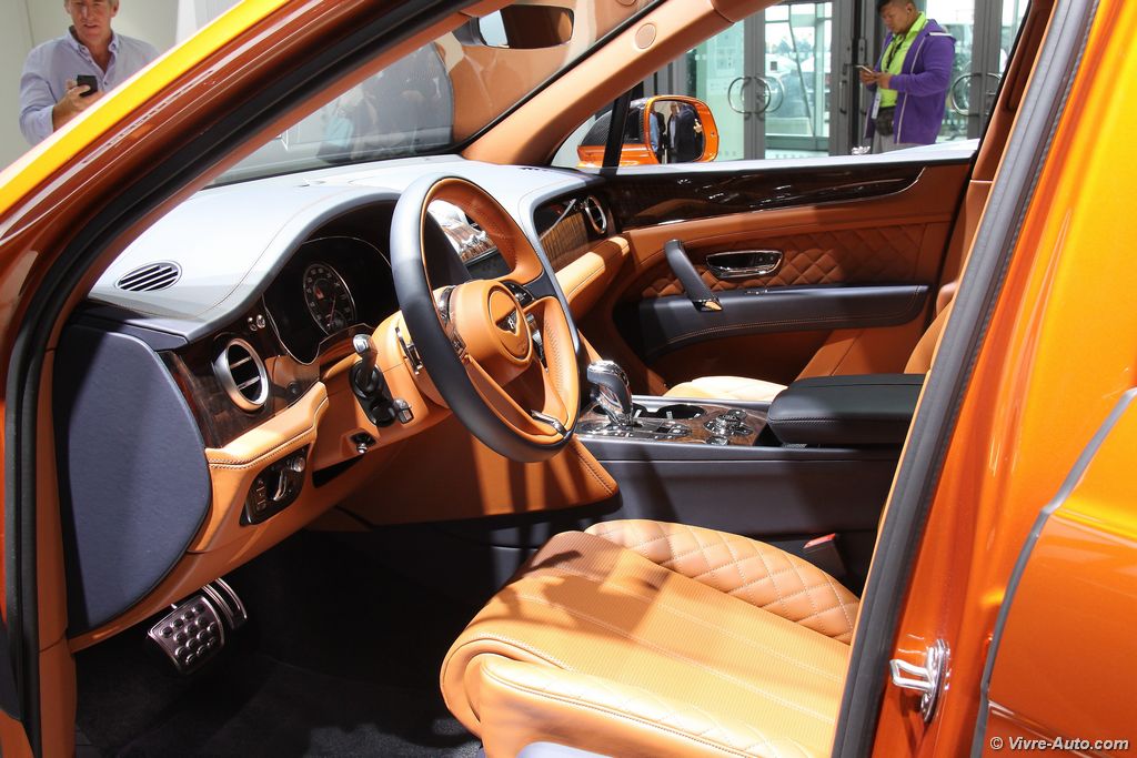 optiques avant, la calandre, ou les feux arrière. Si l’avant n’est pas forcément synonyme de discrétion, la poupe apparaît bien plus sobre. Long de 5,14 mètres il affiche des dimensions plus généreuses, hormis la hauteur, que l’Audi Q7 sur lequel il repose. A bord, la planche de bord nous rappelle celle de la Continental GT, le luxe est bien sûr au rendez-vous avec des matériaux des plus nobles comme le bois, l’aluminium ou des cuirs haut de gamme. Plusieurs combinaisons sont possibles, alliant de nombreuses ambiances au petits détails comme la montre Breitling en passant par les tapis de sol.