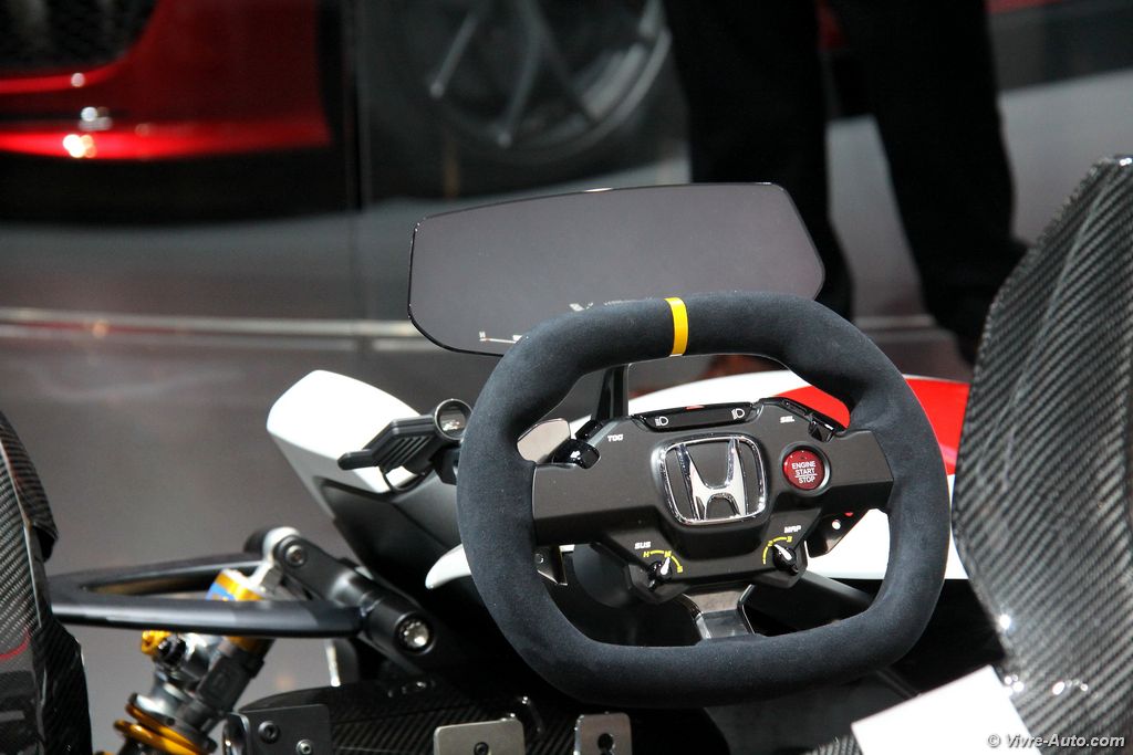 Motoriste dans l’âme avec 28 millions de moteurs tous types produits par an, Honda a réuni son savoir faire pour combiner l’univers de la moto et de la voiture en une seule unité. Position de conduite à gauche, moteur de moto, le tout sur un châssis doté de quatre roues, sont les caractéristiques du Honda Project 2&4. Ce concept est doté du moteur V4 4 temps de la RC213V de MotoGP dans sa version homologuée. D’une cylindrée de 999 cm3 il développe une puissance de 215 ch à 13.000 tr/mn et un couple de 118 Nm à 10.500 tr/mn. Il est accouplé à une transmission à double embrayage DCT à six rapports. Avec seulement 405 kg sur la balance, les sensations sont au rendez-vous avec une position de conduite flottante au plus près du sol. Les indications du tableau de bord sont projetées sur une glace transparente afin de ne pas gêner la vision. Le Honda Project 2&4 s’inspire et rend hommage de la Honda RA272 engagé en F1 en 1965.