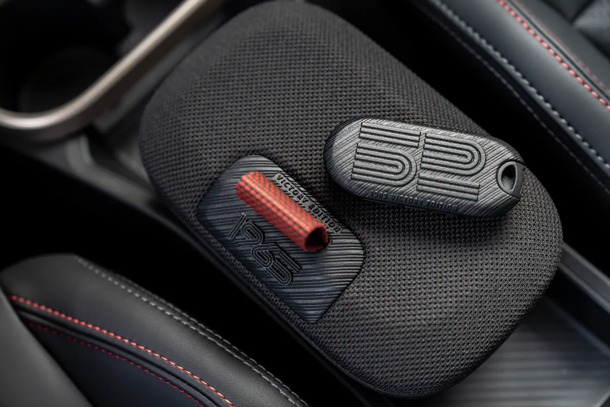 Cette édition spéciale se distingue par l’association de codes visuels des années 60 et la modernité des modèles John Cooper Works actuels. Avec sa teinte Chili Red, la MINI  1965 Victory Edition est traversée par une large bande blanche sportive qui s’étire du capot jusqu’au hayon, créant un contraste saisissant avec le toit et les coques de rétroviseurs peints en Glazed White. L’hommage historique poursuit avec la présence du numéro « 52 » stylisé sur les flancs, rappelant directement la monture victorieuse de 1965. D’autres éléments sont inédits, comme l’immatriculation d’époque reproduite en relief sur le capot ou encore le sticker « 1965 » façon plaque de rallye apposé sur le montant C. La citadine repose sur des jantes de 18 pouces spécifiques bicolores pour la version thermique et noires pour l’électrique complétées par des moyeux flottants et des bouchons de valves exclusifs griffés JCW.