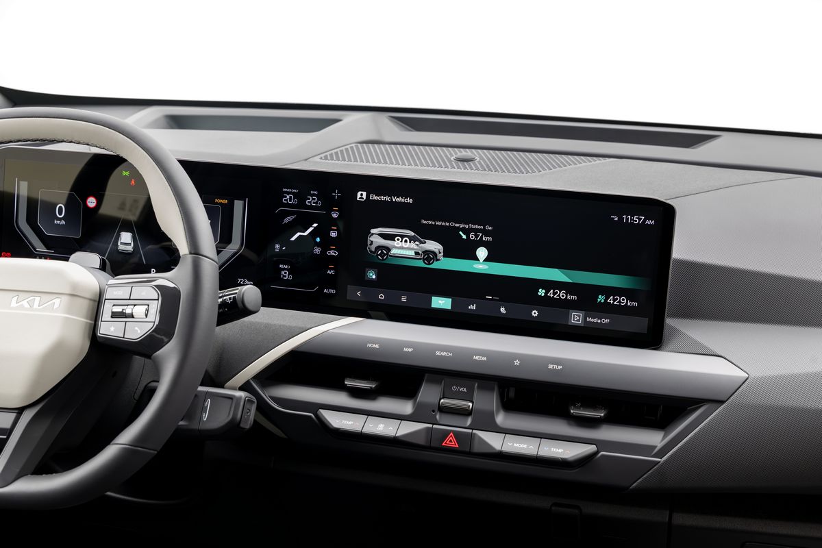 Intérieur du Kia EV5 2026L’EV5 ne fait pas de figuration côté high-tech. Dès la finition d’entrée de gamme, il propose un triple écran panoramique impressionnant réunissant l’instrumentation (12,3″), les réglages de confort (5,3″) et l’infodivertissement (12,3″). Parmi les nouveautés marquantes de 2026, on note l’intégration de l’Assistant IA Kia basé sur ChatGPT, permettant une interaction vocale bien plus naturelle pour gérer les fonctions du véhicule. Les finitions hautes bénéficient également de la clé digitale 2.0 (pour ouvrir sa voiture avec son smartphone) et de la recharge bidirectionnelle (V2L/V2G) pour alimenter des appareils électriques externes.