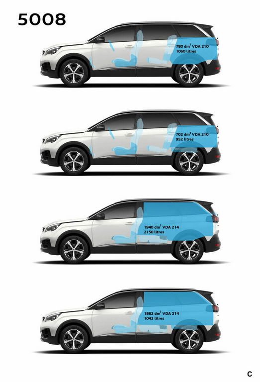 Après nous avoir dévoilé son nouveau 3008 (lire notre article), Peugeot présentera une deuxième nouveauté sur son stand au Mondial de l’automobile, le 5008. Revue en profondeur, ce modèle, qui initialement s’apparentait à un monospace, devient un SUV. Cette transformation, qui visuellement change radicalement le look en affichant les codes stylistiques de son petit frère le 3008, n’a pas pour conséquence de changer l’aspect familial du modèle actuel, bien au contraire. Plus long de 11 cm (4,64 mètres) soit 19 cm par rapport au 3008, le nouveau 5008 offre un empattement de 2,84 mètres. Ainsi, les passagers arrière ont à leur disposition trois sièges indépendants qui s’inclinent, coulissent et s’escamotent dans le plancher. En option sont proposées deux sièges supplémentaires en troisième rangée qui peuvent être retirés complètement et facilement en raison de leur poids réduits (11 kg). Le hayon qui peut bénéficier de l’ouverture mains libres laisse place à un coffre assez volumineux de 1.060 litres en version cinq places, soit 100 dm3 de plus que le modèle actuel. Le siège avant passager est repliable en tablette ce qui permet d’emporter des objets mesurant jusqu’à 3,20 m de long.