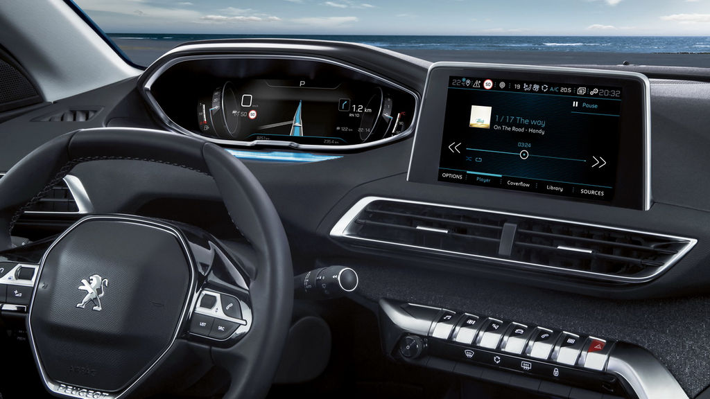 A l’avant, pas de surprise, le 5008 reprend intégralement la planche de bord du dernier 3008, une présentation assez inédite qui offre un petit volant à double méplat derrière lequel on aperçoit un combiné d’instrumentation « i-Coskpit » de 12,3 pouces. La partie multimédia repose sur un écran tactile de 8 pouces positionné en partie supérieure de la planche de bord. La liste des équipements est assez importante, sièges massant, freinage d’urgence, alerte de franchissement de ligne, détecteur de panneaux, détecteur d’angle mort, régulateur adaptatif, feux de route automatiques, aide à la descente, caméra 360°, Park Assist…