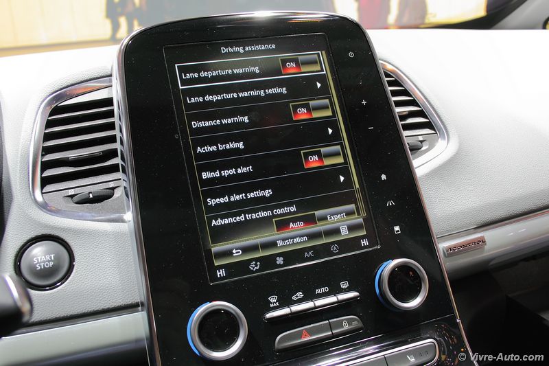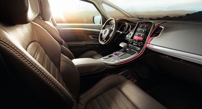 A bord, trois types d’ambiance et de finitions intérieurs sont possibles. Life = planche de bord brun, volant cuir, sièges en sellerie tissus foncé. Zen = planche de bord gris lune ou brun, volant cuir Nappa pleine fleur, décors personnalisés sur la console suspendue, sièges en sellerie mixte brun foncé. Intens = même ambiance que Zen mais sellerie en cuir Riviera brun foncé. Initiale Paris = planche de bord avec surpiqûres gris lune ou brun, sièges en sellerie cuir Nappa pleine fleur dégradé de couleurs gris lune / brun foncé ou brun foncé, volant, accoudoirs et panneaux de porte en cuir Nappa avec confection spécifique. Le combiné d’instruments est entièrement digital et un affichage tête haute en couleur projette la vitesse, la navigation et les aides à la conduite. Le nouvel Espace introduit la nouvelle tablette R-Link 2 avec un écran de 8,7 pouces disposé verticalement. Les fonctions de contrôle sont placées bas à portée de main tandis que les fonctions d’affichage sont placées plus en hauteur. Le GPS Tomtom est à présent en 3D et le système HiFi Bose embarque 12 haut-parleur. La liste des équipements est pléthorique : régulateur de vitesse adaptatif, freinage actif d’urgence, alerte de franchissement de ligne, alerte de distance de sécurité, alerte de survitesse, reconnaissance des panneaux, avertisseur d’angle mort, caméra de recul, feux de route auto, affichage tête haute, aide au démarrage en côte, hayon motorisé, stationnement assisté…