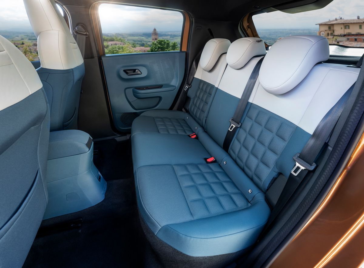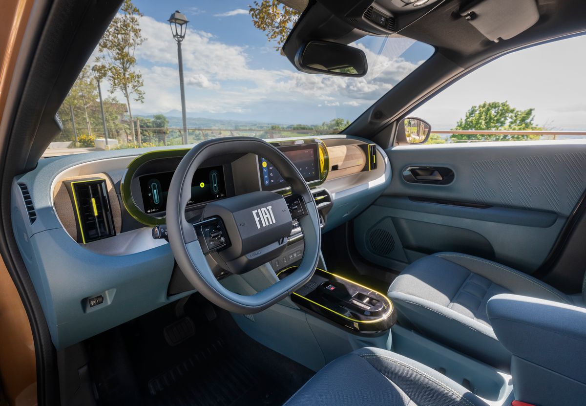 Intérieur de la Fiat Grande Panda Hybride 2025L’intérieur de la Grande Panda Hybride joue la carte de l’audace avec son mélange de bleu et de jaune. Outre son habitabilité généreuse pour un véhicule de 3,99 mètres, elle innove par ses matériaux. On y retrouve le BAMBOX, un matériau à base de fibres de bambou pour la planche de bord, ainsi que des plastiques issus du recyclage de briques alimentaires. Côté pratique, le volume de coffre s’établit à 412 litres, un chiffre excellent pour la catégorie, tandis qu’un compartiment de 13 litres vient s’ajouter au tableau de bord pour les petits objets du quotidien.