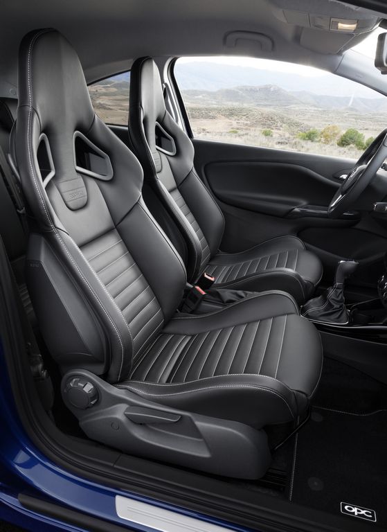 A première vue, la Corsa OPC montre qu’elle a du caractère ! Cette version sportive intègre une nouvelle face avant aux généreuses prises d’air. Pour accentuer son côté athlétique, le capot dispose d’une écope en son sommet. Petit clin d’œil à sa grande sœur, l’Astra OPC, avec les moulures en aluminium sous les phares. Les passages de roue et les bas de caisse deviennent plus imposant et l’arrière se dote d’une double sortie d’échappement Remus avec diffuseur. Deux type d’aileron sont disponibles, le premier, monté de série, plutôt discret et le second un peu plus flamboyant. La teinte de carrosserie bleu présente sur les photos est exclusive. A bord, la touche sportive est présente à l’instar des sièges Recaro, du volant cuir avec méplat inférieur, du pédalier sport et du sigle OPC présent sur le pommeau du levier de vitesse.