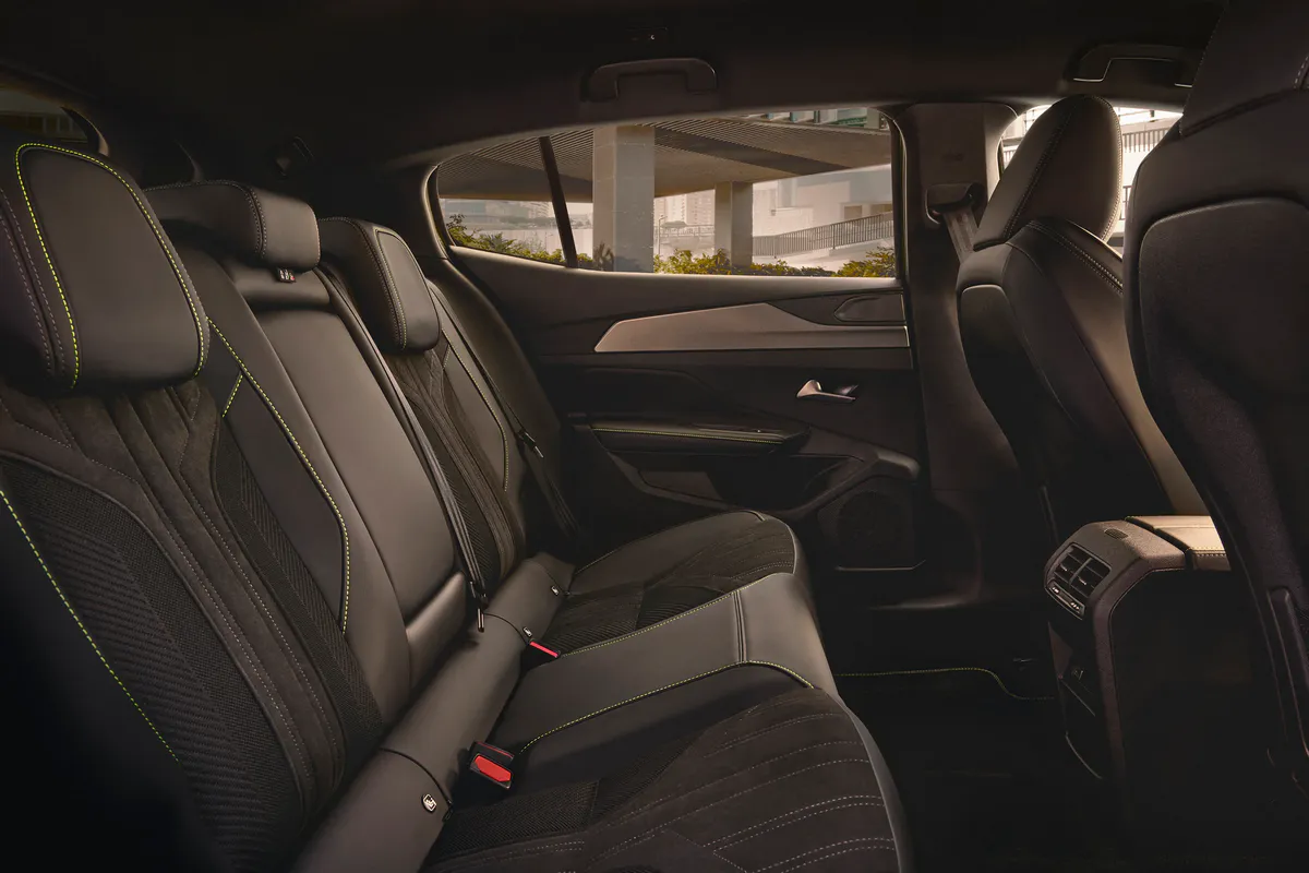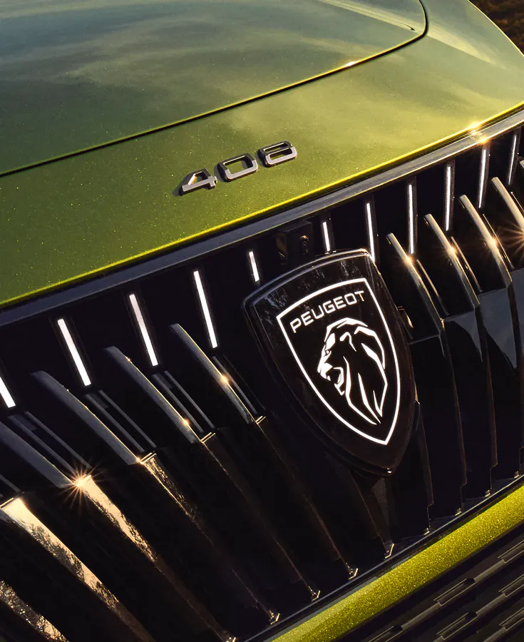 Pour accentuer cet « Effet Wow », la 408 mise sur la lumière : elle est la première Peugeot à proposer un lettrage « PEUGEOT » rétroéclairé à l’arrière, niché sous le bandeau translucide. À l’avant, le blason central s’illumine également (sur les finitions GT), tandis que les célèbres griffes LED sont désormais reliées par un fin liseré lumineux. Ce look est complété par la teinte inédite Flare Green, capable de passer du vert profond au jaune acide selon l’exposition.