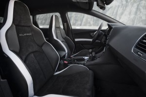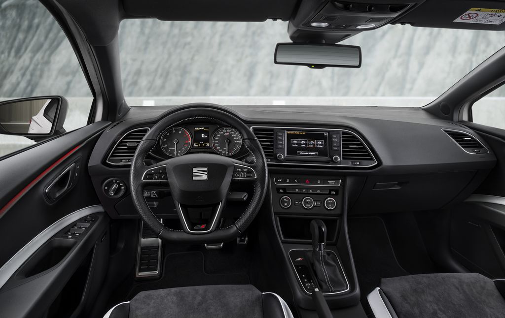 A bord, des sièges sport Alcantara gris foncé avec surpiqures blanches ou une une sellerie cuir intégral noire sont proposés mais pour plus de sportivité, des sièges baquet sont disponibles en option. Le pédalier et les seuils de portes sont en aluminium et les éléments de finition du cockpit sont de couleur noir brillant. Le volant sport Cupra à méplat dispose de surpiqûres comme le pommeau de levier de vitesses. L’éclairage d’ambiance est accentué par des LED dans les contre-portes qui passent du blanc au rouge selon le sélecteur de conduite.
