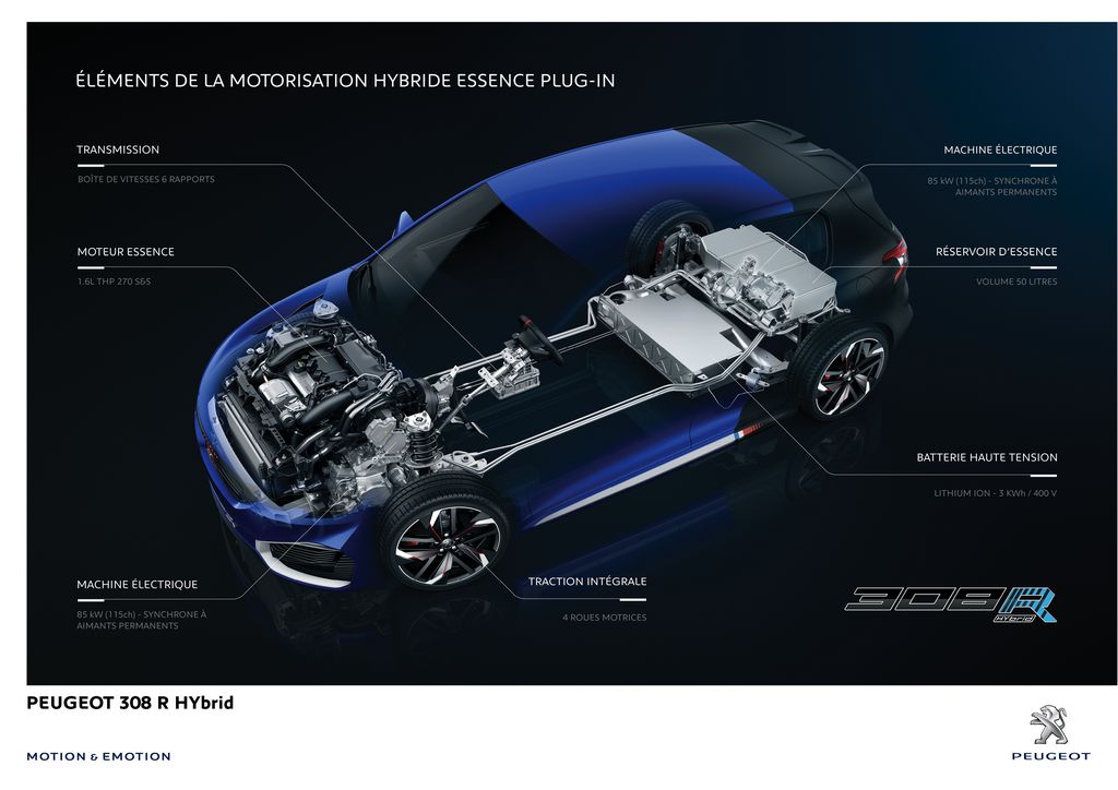 Comment les ingénieurs ont-ils réussi cette prouesse ? Sous le capot de la 308 R HYbrid se trouve le moteur 1,6 THP de 270 ch repris de la RCZ R. Il est ici associé à deux moteurs électriques de 115 ch, l’un situé sur le train arrière et l’autre relié à la boîte de vitesses à six rapports. Quatre roues motrices oblige, le résultat est impressionnant, puisque la compacte affiche une puissance cumulée de 500 ch. Avec un rapport poids/puissance de 3,1 kg/ch, elle franchit le 0 à 100 km/h en à peine 4 secondes et atteint les 250 km/h en vitesse maximale, limitée électroniquement. Les ingénieurs ont déplacés le réservoir à carburant dans le coffre au profit d’une batterie de 3 kWh. Le poids est réparti de 60% sur l’avant et 40% sur l’arrière.