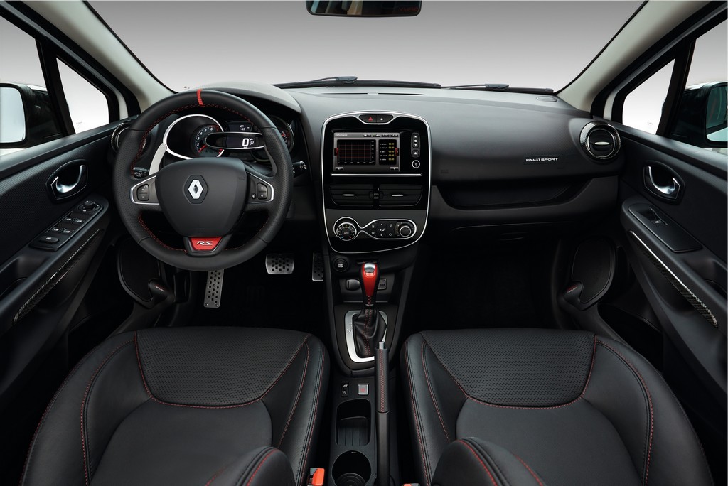 La Clio R.S. Trophy est disponible en cinq teintes de carrosserie, Blanc Glacier, Noir Profond, Rouge Flamme, Jaune Sirius et un Gris Nacré vernis Mat exclusif à cette version. Elle se distingue par ses jantes 18 pouces Radical diamentées noir chaussées de pneumatiques Michelin Pilot Super Sport et surtout par le marquage Trophy sur la lame type F1 à l’avant. Série limitée oblige, le seuil de porte affiche le numéros du modèle. A bord, le ton est donné avec des sièges sport en cuir avec appuie-têtes intégrés, des inserts look carbone entourent les aérateurs et les joncs de porte. Le R.S. Monitor, toujours proposé en option ajoute une nouvelle fonction qui permet d’ajuster la progressivité de la pédale d’accélérateur selon cinq modes.