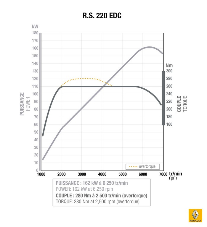 Comme c’est le cas avec la Mégane R.S. Trophy, la Clio dotée de cette série limitée propose plus de performances que la R.S. classique. Pour ce faire, le 1.6 l turbo gagne 20 ch et 40 Nm (220 ch, 280 Nm) grâce à une nouvelle cartographie, un turbo plus gros et un circuit d’admission réduisant les pertes de charge. Le système d’échappement, quant à lui, est revu et accueille un catalyseur Euro6. La boîte EDC a également été retravaillée, elle offre des passages de rapport plus rapide juqu’à 30%. Le châssis est abaissé de 20 mm à l’avant et de 10 mm à l’arrière et les suspensions sont renforcées. Enfin, la direction est encore plus précise avec l’adoption d’une nouvelle crémaillère à démultiplication réduite. Le 0 à 100 km/h passe de 6,7 secondes à 6,5 secondes et la vitesse max gagne 5 km/h (235 km/h).
