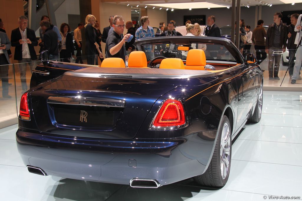 Baptisée Dawn, signifiant l’aube, elle se rapproche fortement de la Ghost sur le plan esthétique, le constructeur anglais précise toutefois que 80% des éléments de carrosserie sont inédits. La grande capote en toile se dissimule en 22 secondes dans un silence record. Les portes à ouverture inversée libèrent l’accès aux deux places arrière. La Dawn est animée par le V12 de 6,6l de 570 ch et 780 Nm de couple d’origine BMW. Malgré les 2,5 tonnes du cabriolet il lui permet de réaliser le 0 à 100 km/h en 4,9 secondes et d’atteindre la vitesse maximale de 250 km/h.